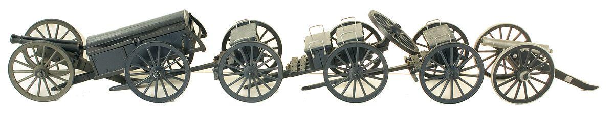 Both cannons are 8" long, set into 7 3/4" wide carriages, with one painted silver and the other black. Neither has a functioning touchhole. Included with the lot is four magazine carts of similar scale. Very good or better overall.