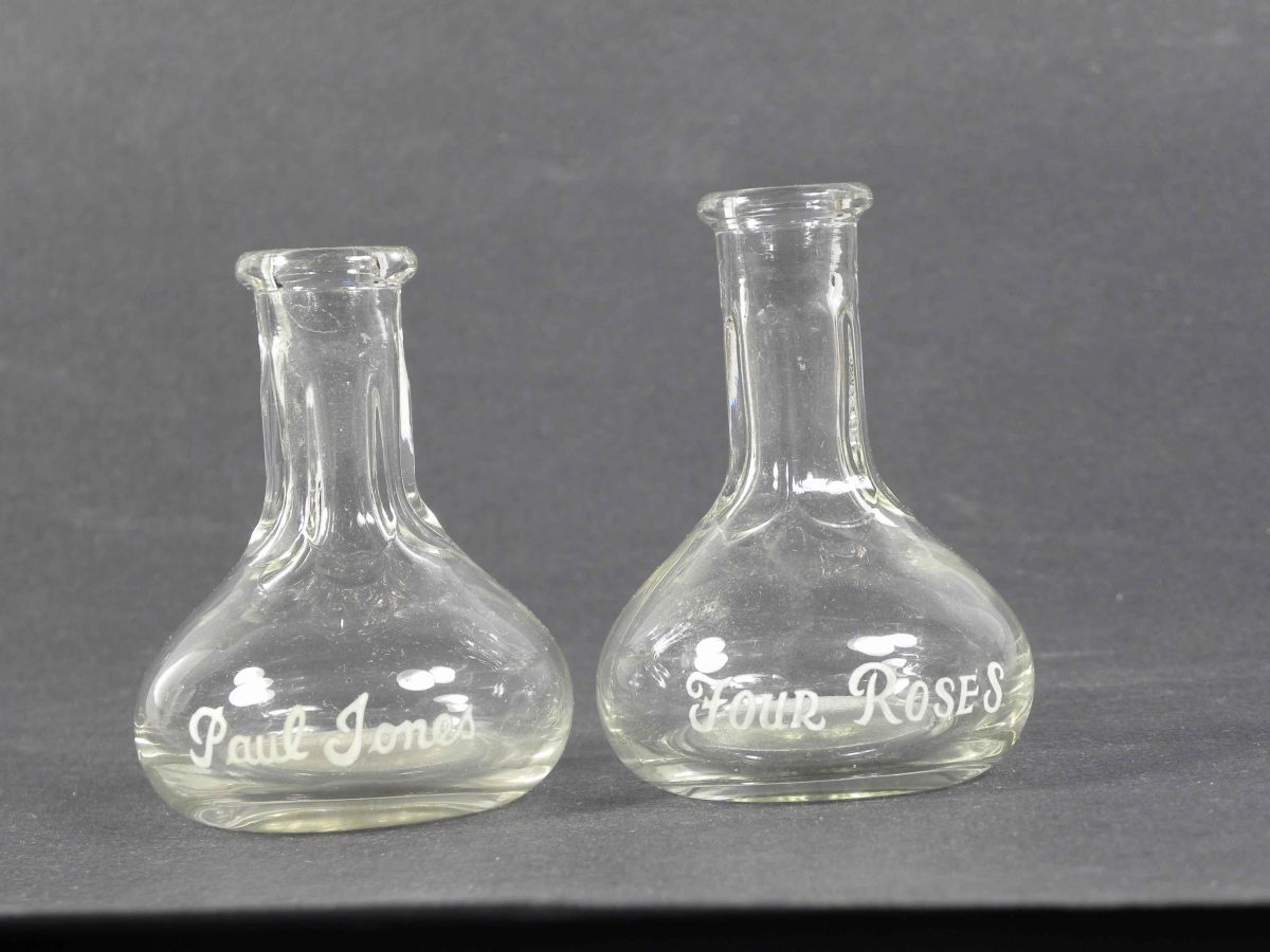 Lot of Two Miniature Hotel Decanters including Paul Jones and Four Roses with enameled labels. No chips or cracks, excellent condition. Aprox 3 inches tall.