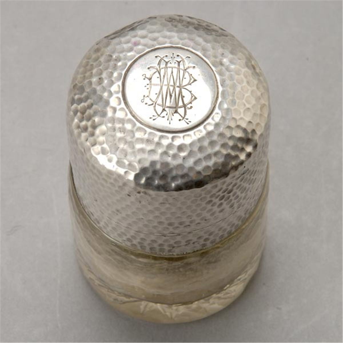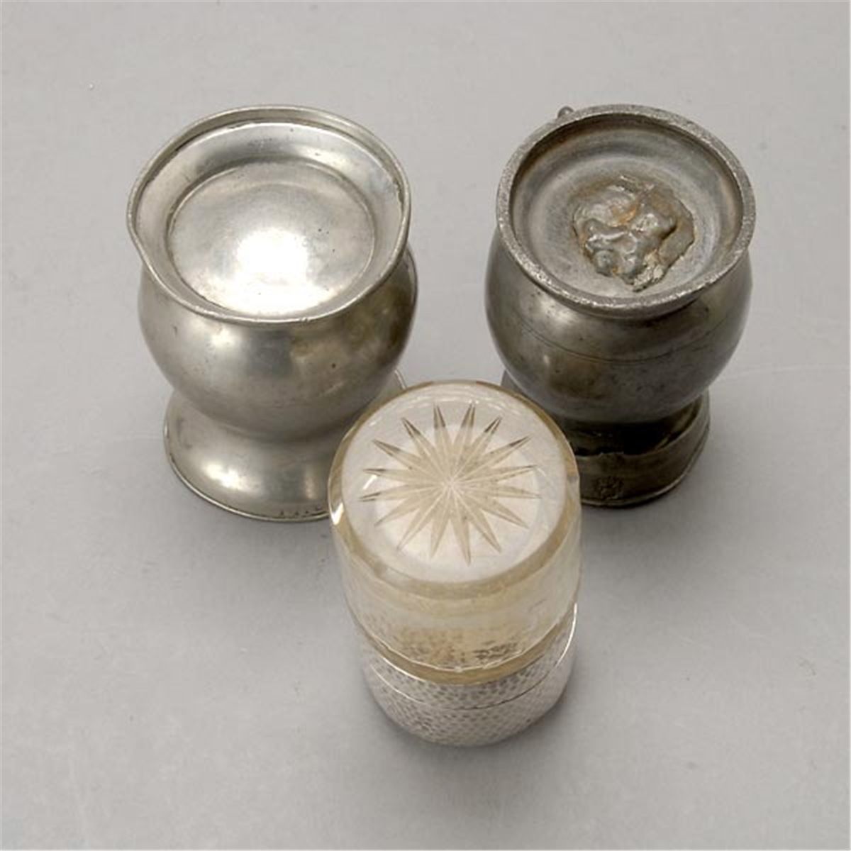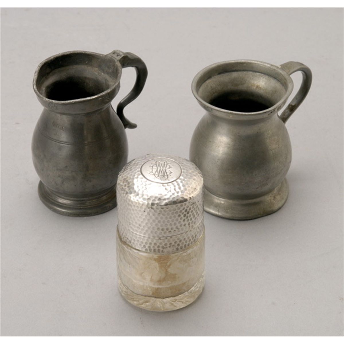 Two Miniature Scottish Pewter Mugs; together with a silver mounted dresser jar (3) {Height of jar 3 1/4 inches}