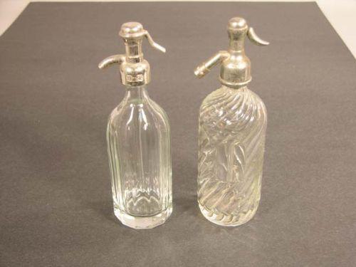 Two miniature seltzer bottles, 1 fluted - 1 swirl patter, 6.5" tall, ex. cond.