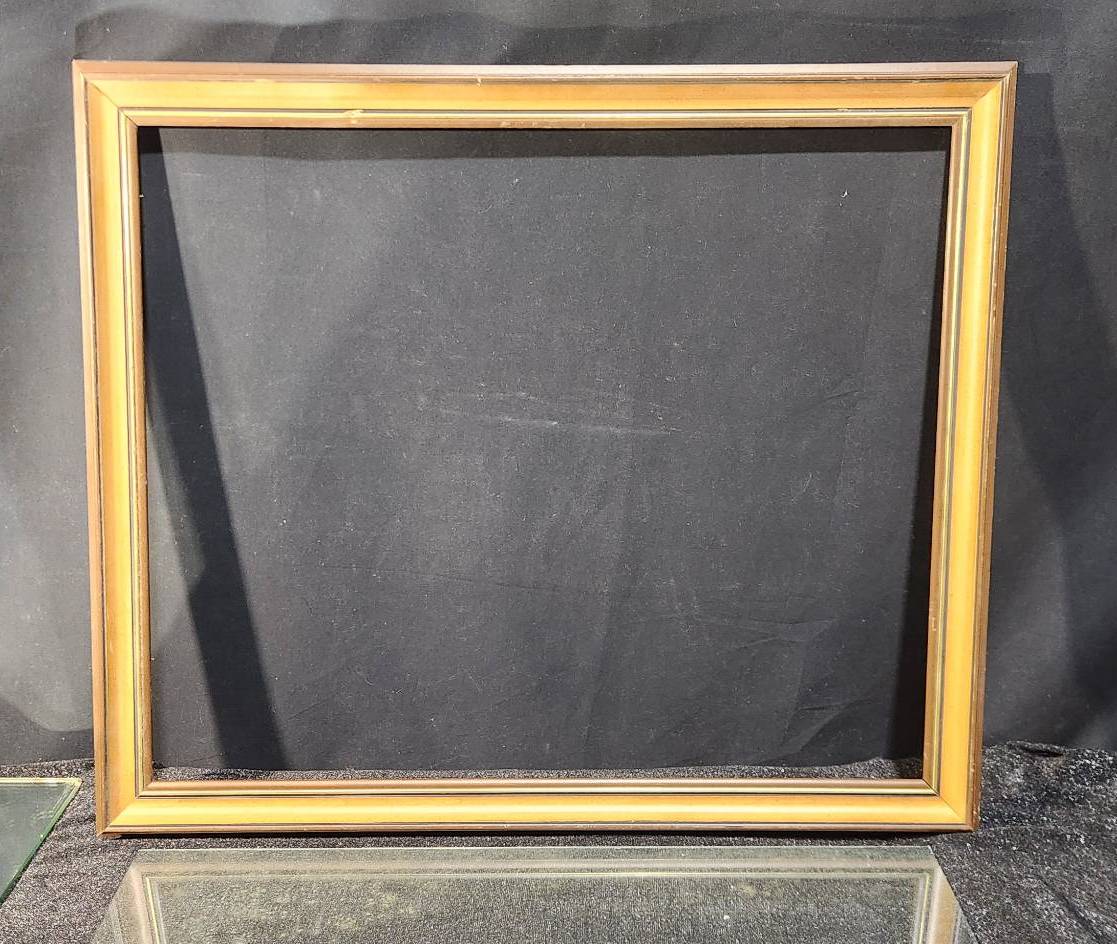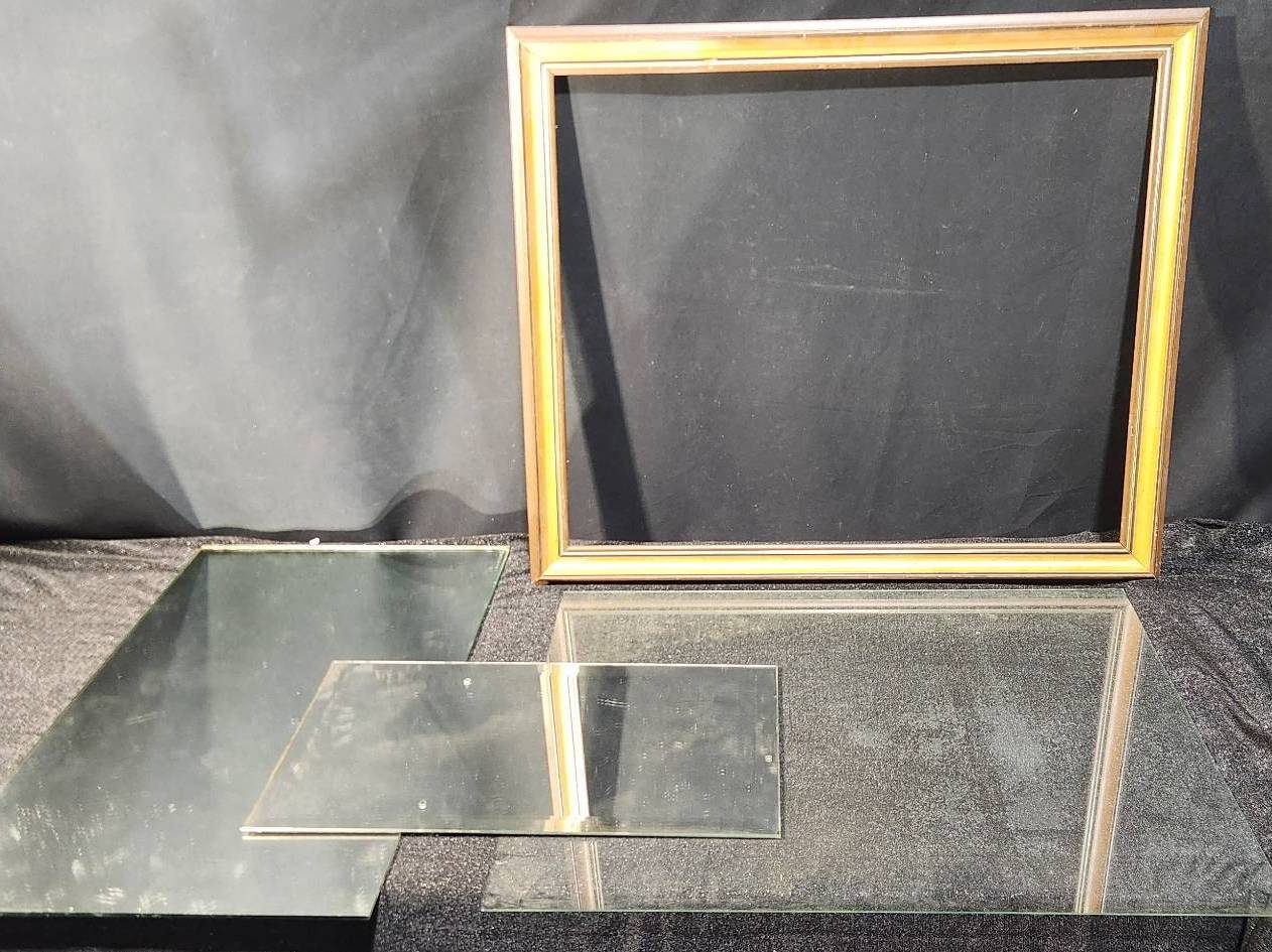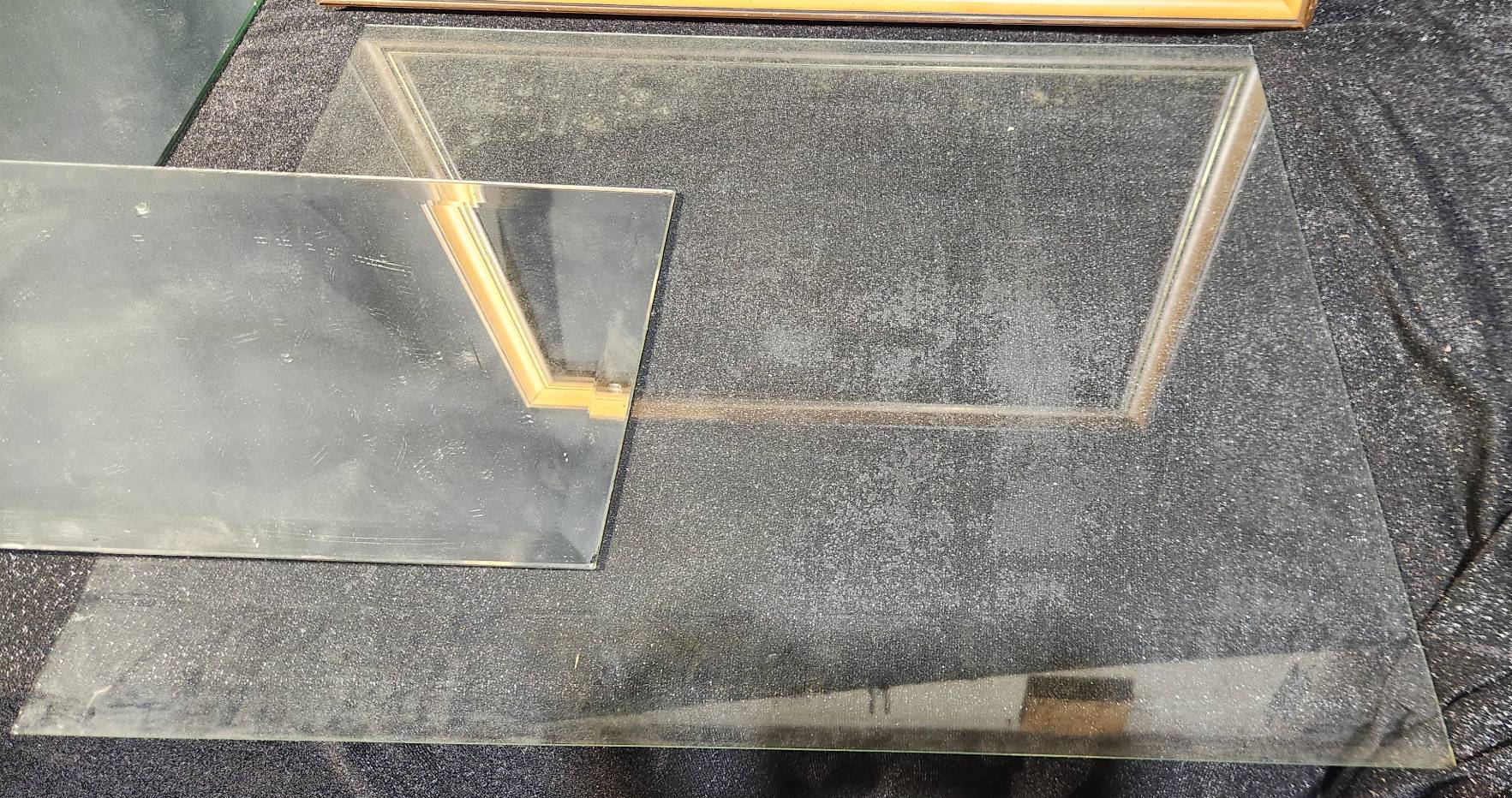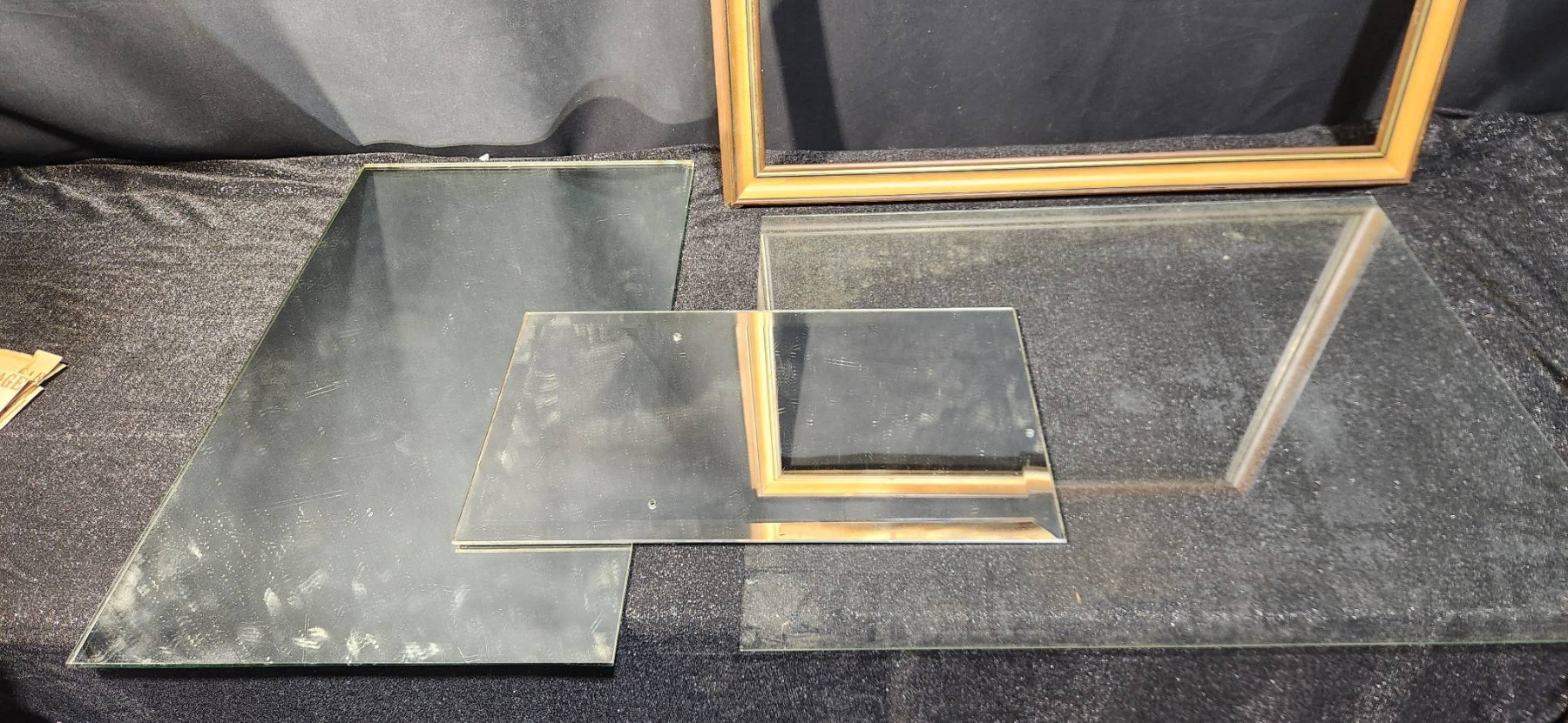 Includes two mirrors measuring 22″ x 13″ and 18″ x 33″, as well as a wooden frame with a glass insert. All items are stored in a carry box. The frame requires reassembly, and the mirrors and glass need cleaning. Mirrors and frame are otherwise in good overall condition.
