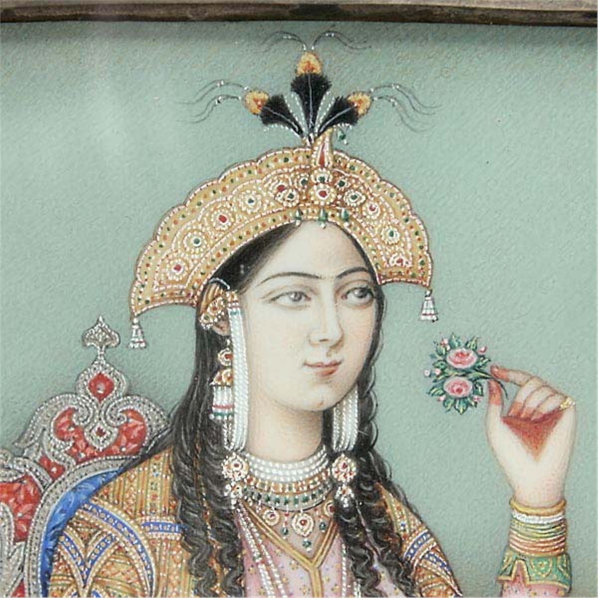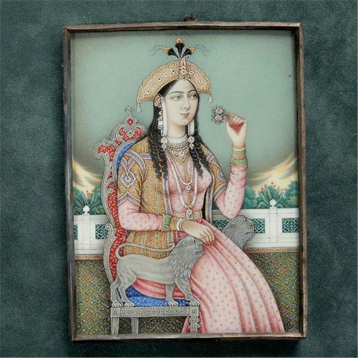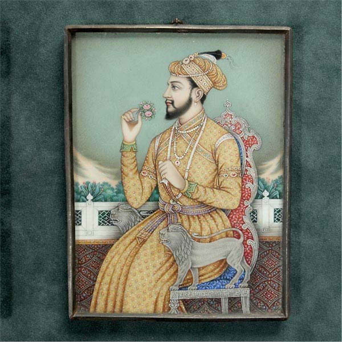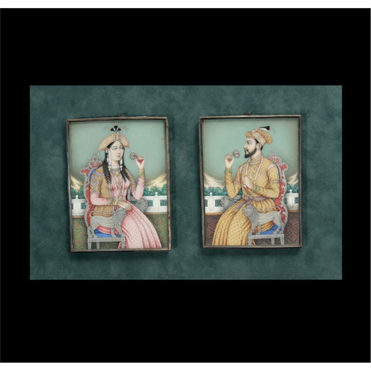 Two Mughal-Style Miniature Portraits, Painted in gouache, gilt and silver, one depicting a turbaned ruler in profile, the other of his consort, each in three quarter-view with original metal frame, further mounted and framed together, glazed. Each Portrait: 4 x 3 inches (10.2 x 7.6 cm) approximately Provenance:From a Napa Valley Estate.