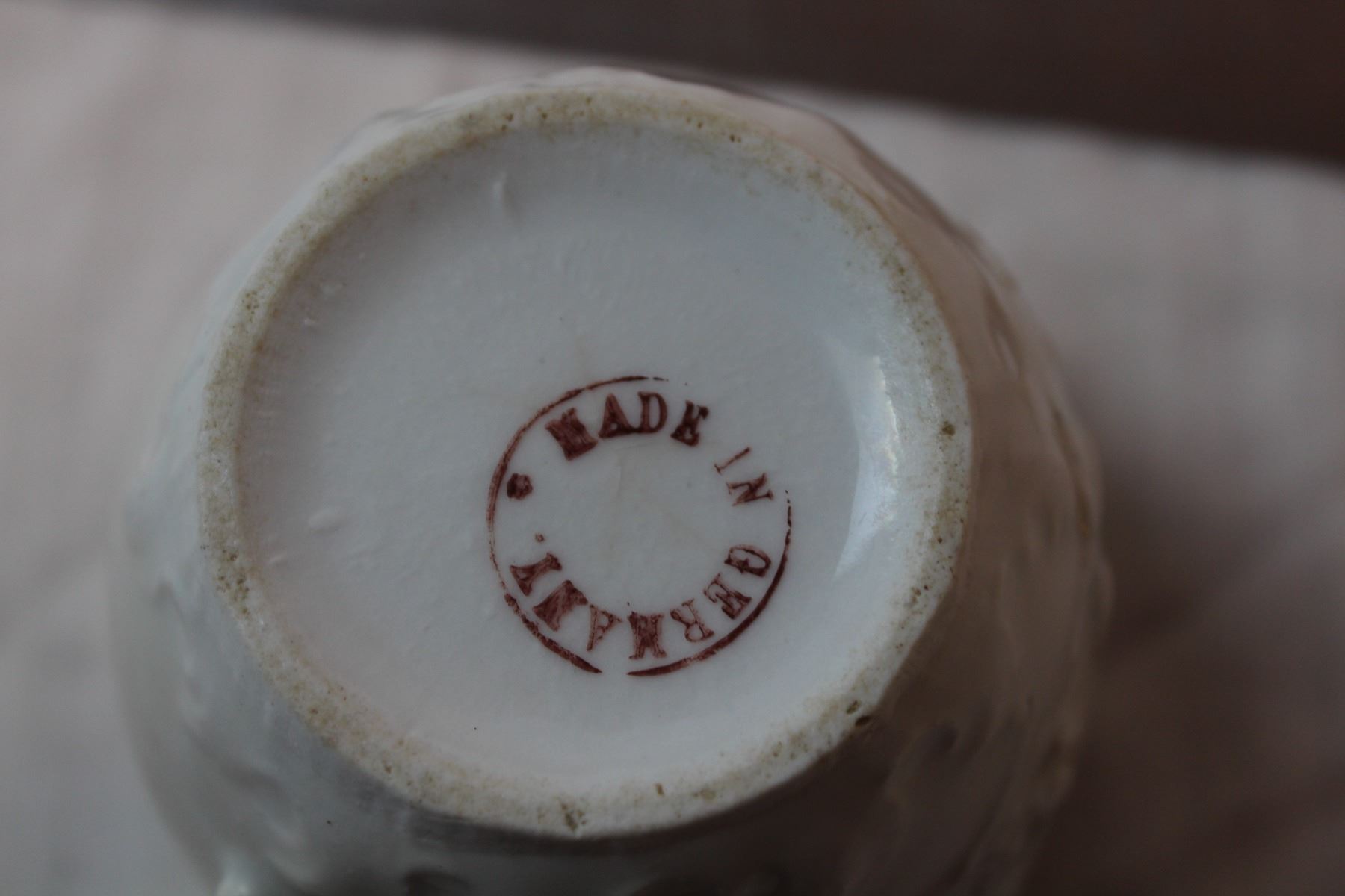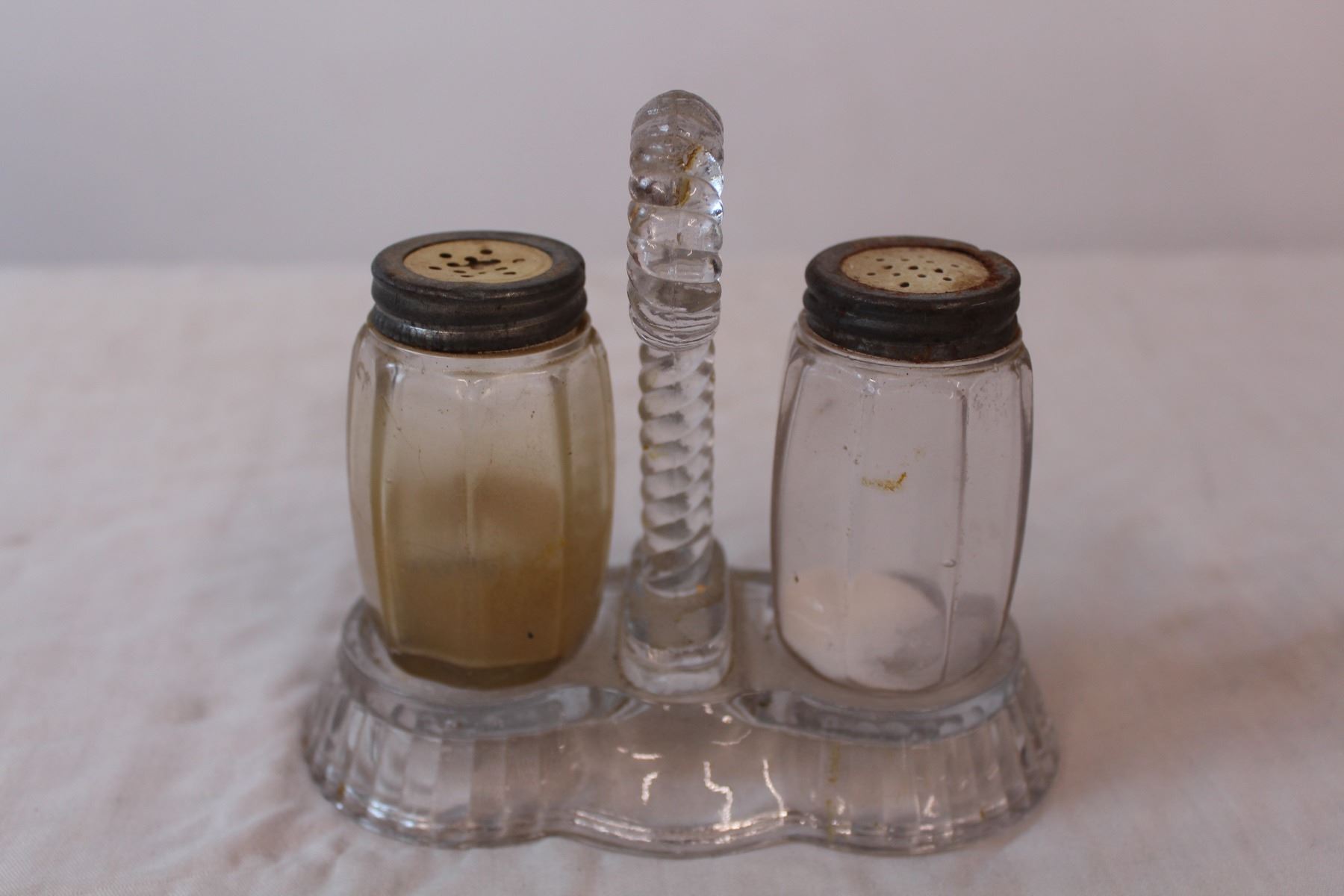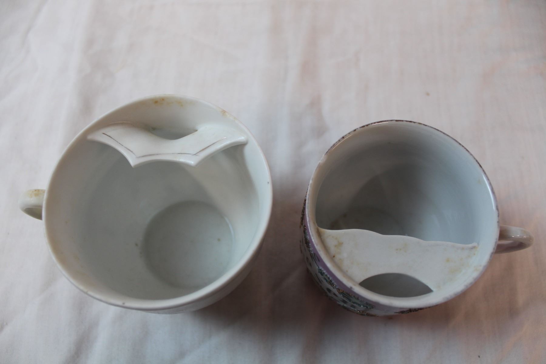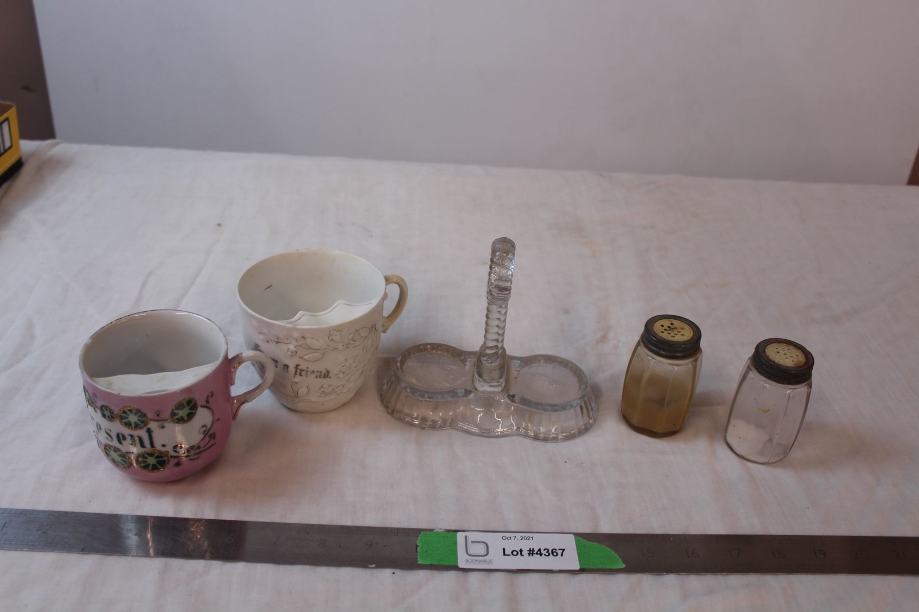 Two Mustache/Shaving cups, salt and pepper shaker with holder