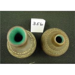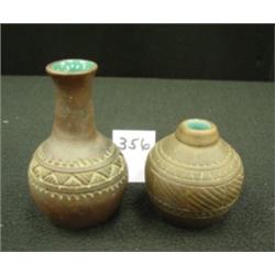 Two Native American pottery pieces. Miniatures. 2-1/2" tall and 3-7/8" tall. Surfaces hand carved, interiors have turquoise blue glaze. Incised marked in base: SWO with arrowhead. Possibly modern Iroquois souvenir pieces. Condition: