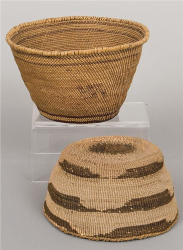 Two Northwest Coast and California Baskets. (1) Makah- finely woven - 4 ½” x 8". Good condition. (2) Modoc Basketry hat is 3 ½” x 6". Fine condition. (est $600-700)