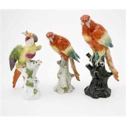 Two Naples porcelain bird models, parakeet-types, 9ins and another, German, 11ins (some damage)...