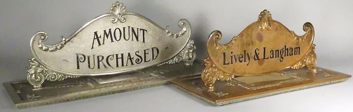 Two National Cash Register Co. Top Signs with top covers. Brass for Lively & Langham-16 1/2 X 5 3/4 and nickel "Amount Purchased", 13 X 5 3/4 inches.
