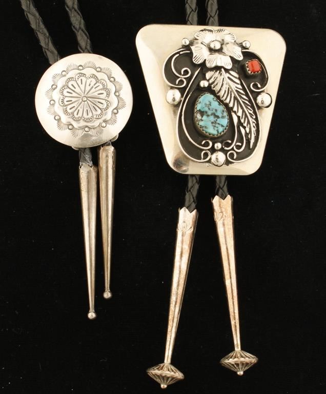 One has turquoise and coral stones set in a flower filigree pattern and the other is a sun rosette symbol. Both are in very good condition.