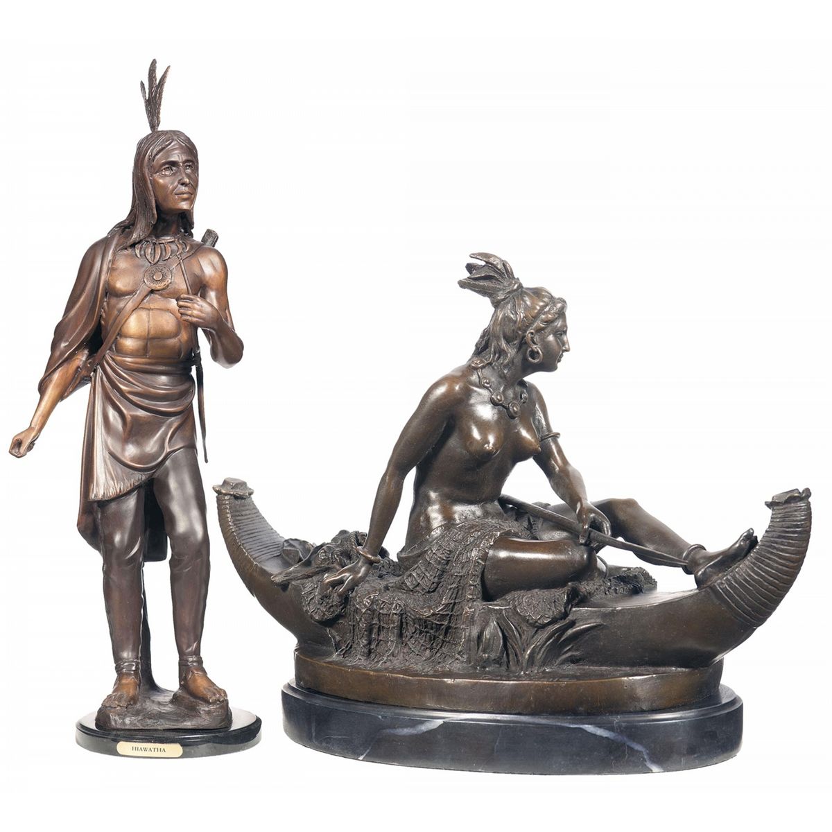 1) This large bronze sculpture is of Hiawatha who was an Iroquois Indian Chief who lived in the 16th Century. He is standing with a bow in one hand looking attentively into the sky. He is dressed in Native American attire with a peace medal around his neck. Measures 33 inches tall. 2) This bronze is also known as Indian Maiden in Canoe. The Indian squaw is paddling her canoe going to market. Her eyes glance sideways to the bank while her feet rest prone to the canoe. She is dressed in fancy Native American attire and the bronze rests on a contoured marble plinth. Measures 15 inches long x 11 inches high x 9 inches wide. The bronze is signed on the left side of the base "Duchoiselle" (French 19th C.).