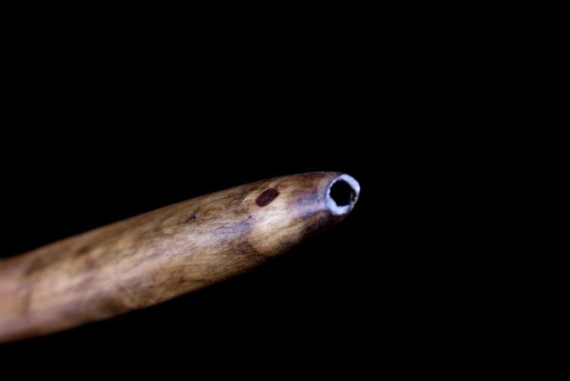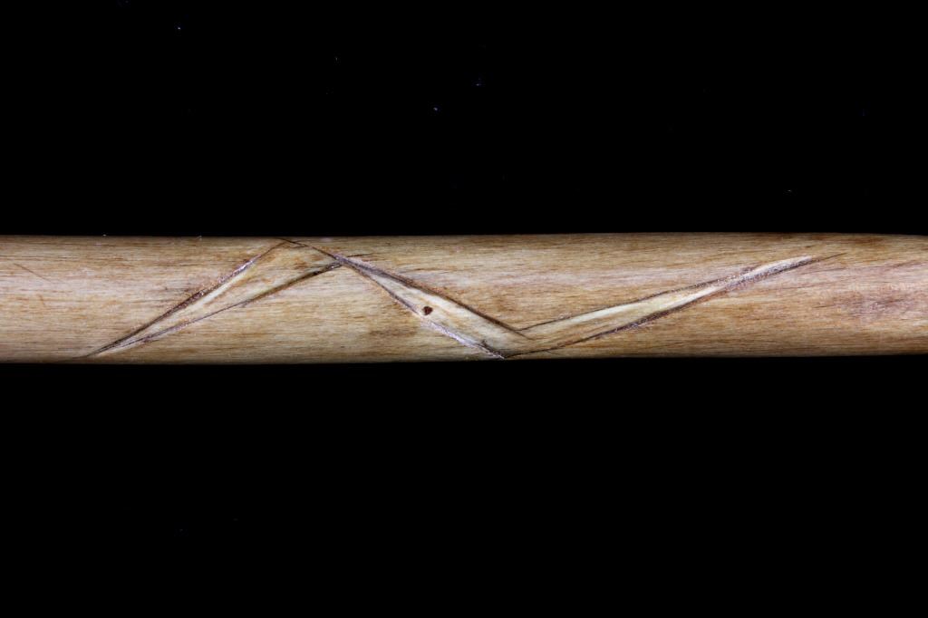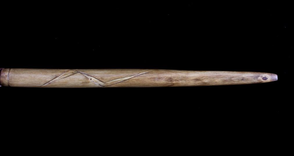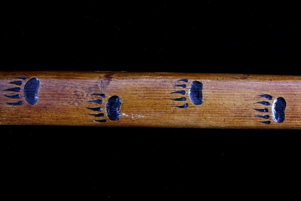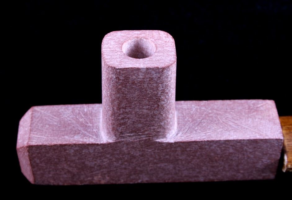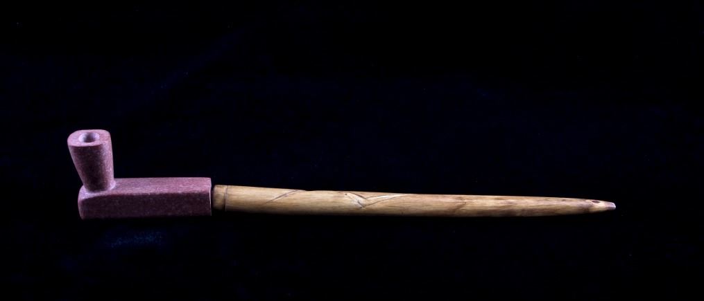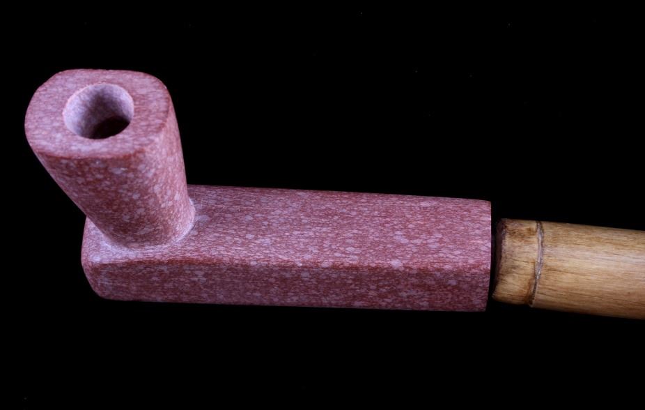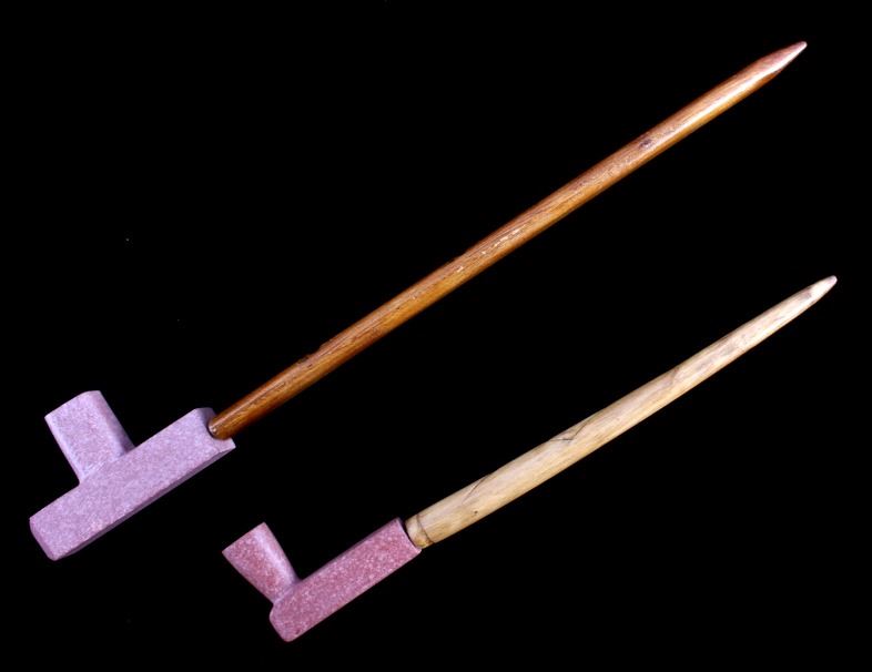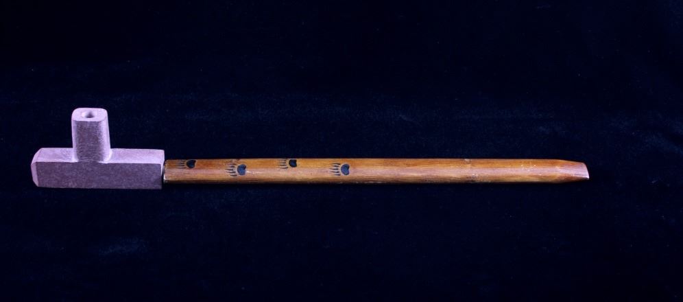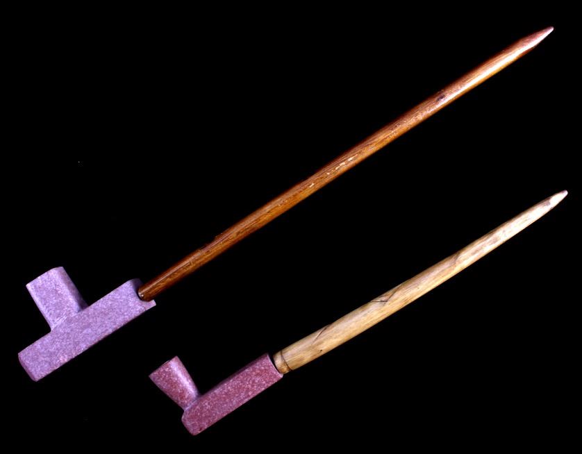 For bidding is this pair of Native American Catlinite Calumet pipes. The first pipe is a large "T" pipe paired with a wide, flat stem. The top of the stem is engraved with four bear paw prints. The Catlinite portion of the pipe measures 4.5" long x 2.5" high. Pipe and stem together measure 18.5" long. The second pipe features a smaller person T-bowl catlinite pipe with a rounded stem. The top of the stem features a lightning bolt like design carved into it. The catlinite portion measures 3.25" l x 2.25" w; overall length is 13.25". Both pipes show new condition.