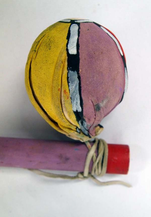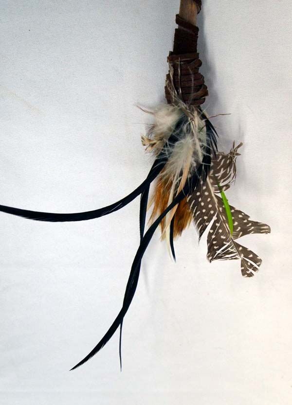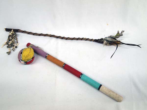 Two Native American Ceremonial Staffs. Ceremonial sticks have been used through the ages for praying, dancing and medicinal purposes. Made with natural materials 1) tipped with feathers and bound with leather wound to the opposite end which has trade shells and small bells. 2) is a dowel with a bag or pouch on the end and painted with bright colors. The longest is 32''.