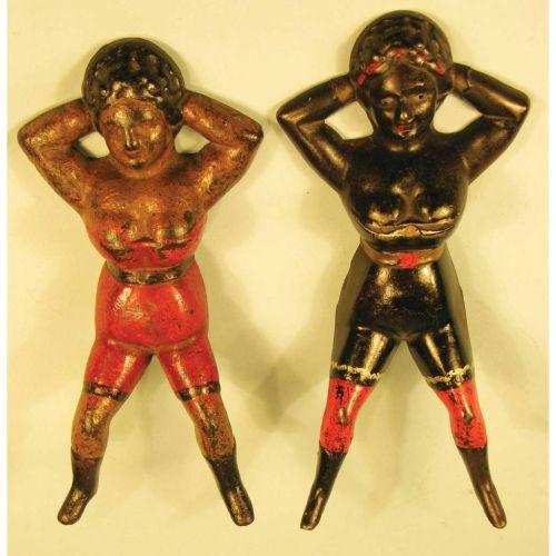 Two Naughty Nellie Boot Jacks, with black with red bloomers and red bathing suit. Most of original paint intact. 10 inches long each.
