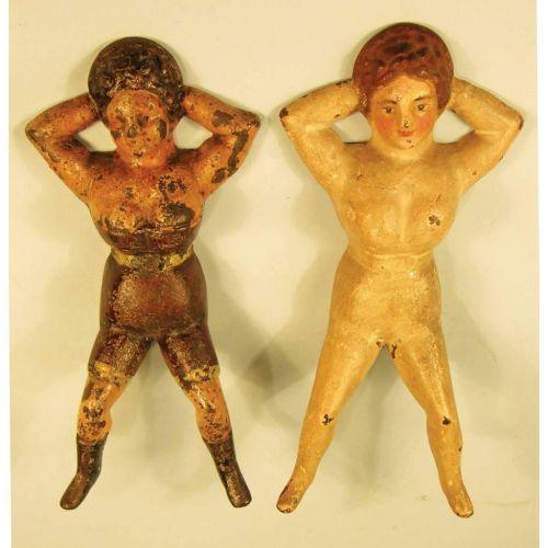 Two Naughty Nellie Boot Jacks, with brown bathing suit with green belt and one nude. Most of original paint intact. 10 inches long each.