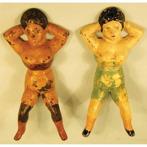 Two Naughty Nellie Boot Jacks, with green bathing suit and brown tank top. Most of original paint intact. 10 inches long each.