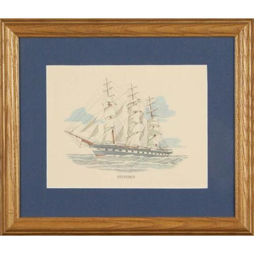 **1** This is a nautical print of the ?Hesperus?. A reproduction of a watercolor that is in excellent condition and displays the brilliance of the artist?s use of negative space to complete shapes. Very appropriately framed in a stained wood frame which compliments the colors of the ship?s wood, and matted in a navy blue mat that compliments the colors of blue on the ship. This 11.75? x 13.5? picture is priced at an excellent price making this picture very desirable.