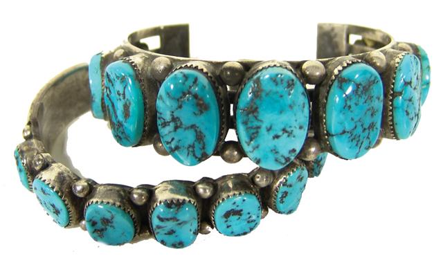Circa 1980s, Pair of vintage hand wrought silver and turquoise row bracelets, each set with 7 Blue Gem turquoise cabochons. 5-3/4" plus 1-1/2" gap x 1-1/2" gap x 7/8" wide; 5-1/2" plus 1-1/2" gap x 3/4" wide