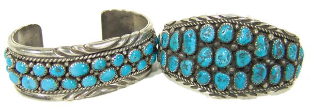 Circa 1980s, Pair of vintage hand wrought silver and turquoise bracelets set with Blue Gem turquoise cabochons. 5-1/2" plus 1-1/2" gap x 1-1/2" wide, 5-1/2" plus 1-1/2" gap x 1" wide
