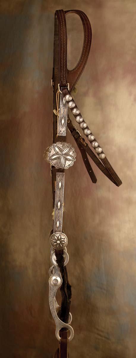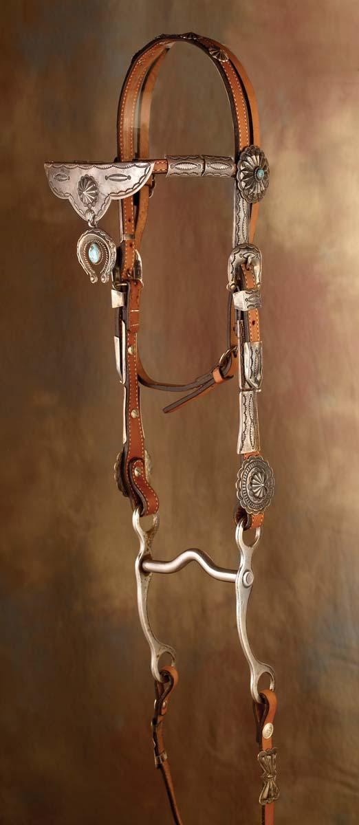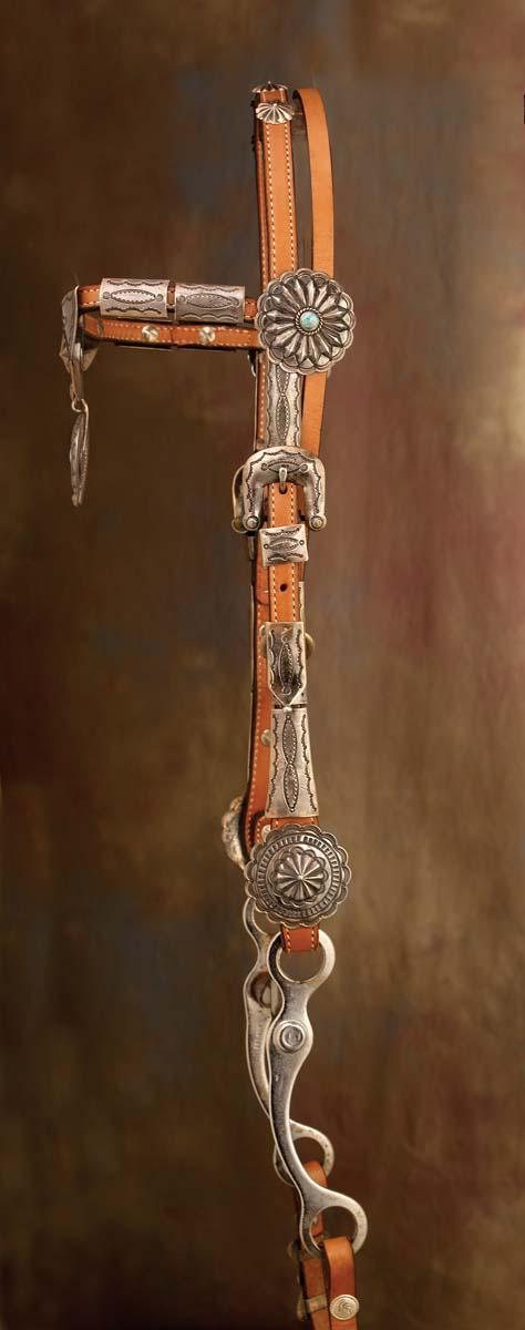 a) Stamped silver and turquoise with 2 1/4" scalloped conchos, 1" buckle sets with nice brow plate and naja butterfly conchos on reins. Fine condition, c 1950; b) Stamped silver with 1 1/2" and 2 1/4" conchos and liberty dime spots on the throat latch. Fine condition, c 1960