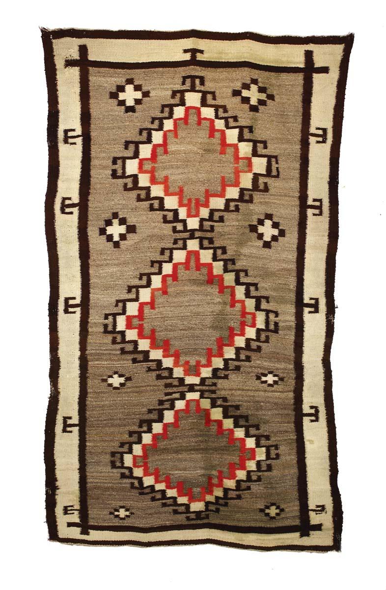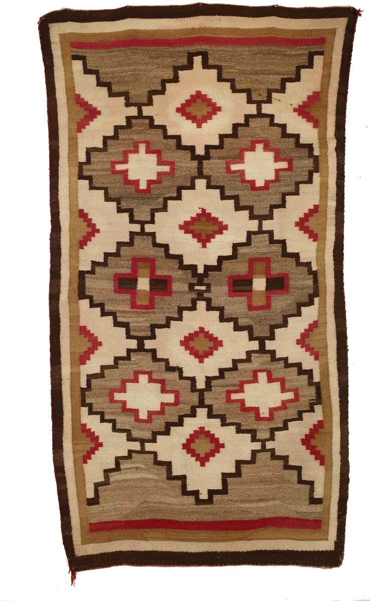 a) 85 x 49 Connected hooked diamonds in red, black and white on grey field with unusual T border. Fair condition with some holes, wear stains and edge damage, c 1930; b) 82 x 42 Overall geometric designs in red, black, tan and grey on white field. Good condition some minor damage and edge wear, c 1930