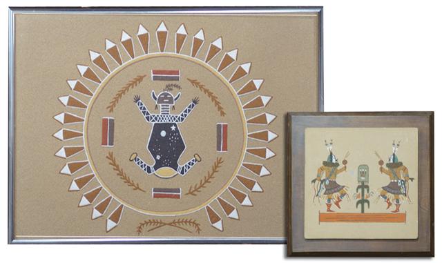 Late 1900s, Pair of traditional sand paintings done on wood, one pictorial with dancers, the other with symbols. 18" x 24", 13" x 13" (17" x 17" framed)