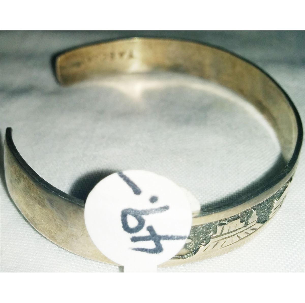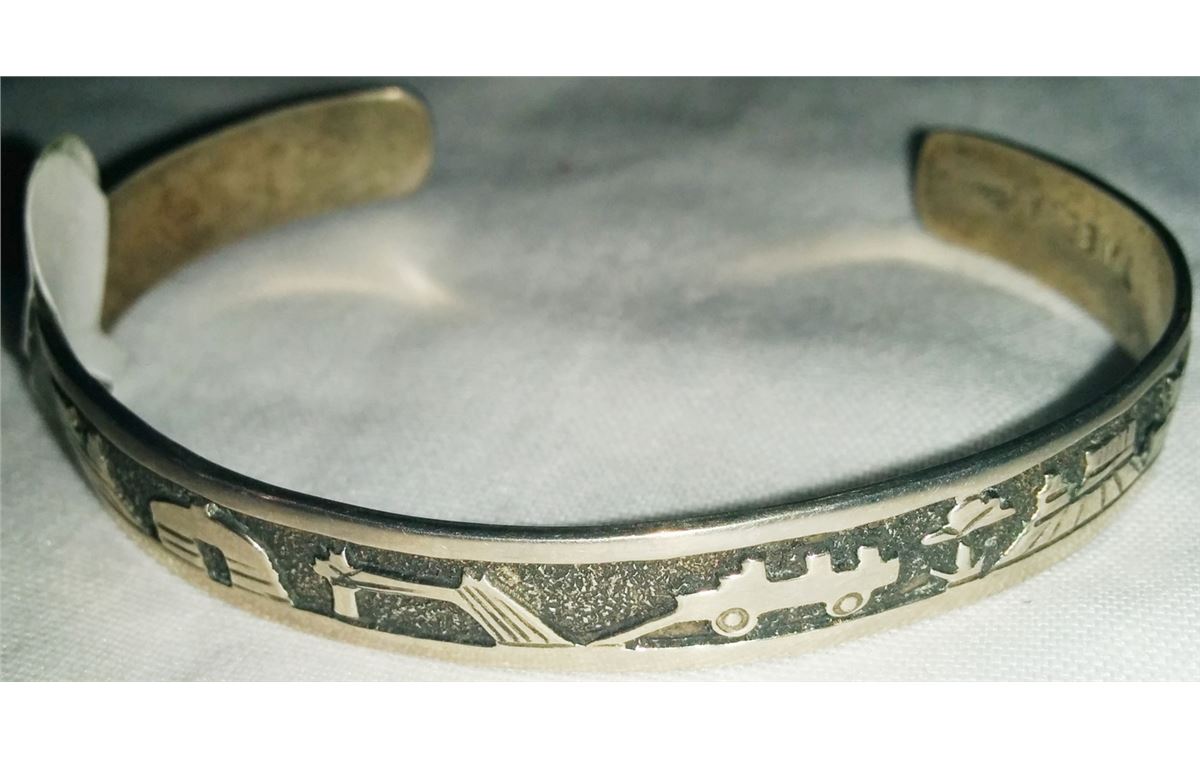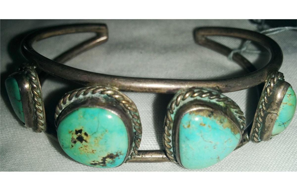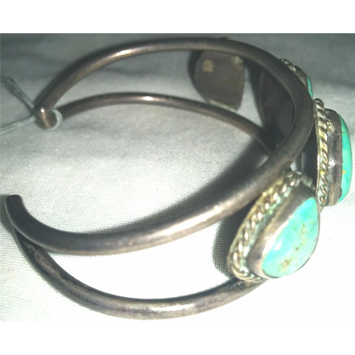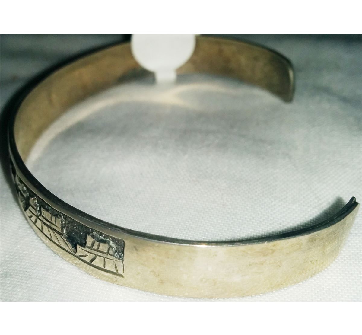 Two Navajo Sterling Silver and Turquoise Cuff Bracelets from approx. 1950's. One of the bracelets has a story teller design and measures approx. 6" x 3/8" and the other measures 5 3/4" x 5/8". The total weight is approx. 24.4 grams. Condition: Used condition, see images. Shipping: $14.50.