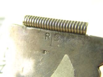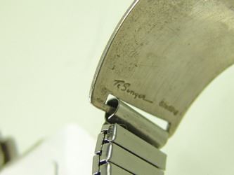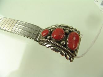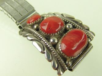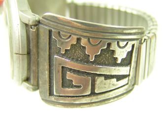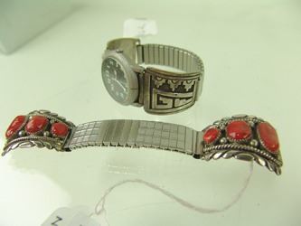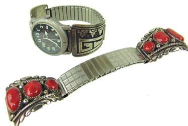Pair of classic, all silver watch tips including one Hopi overlay style by Tommy Singer, and a carved coral pair by Robert Leekity. Both in very good condition with good patina. On flex bands. Ca. 1970s-1980s. Adult.