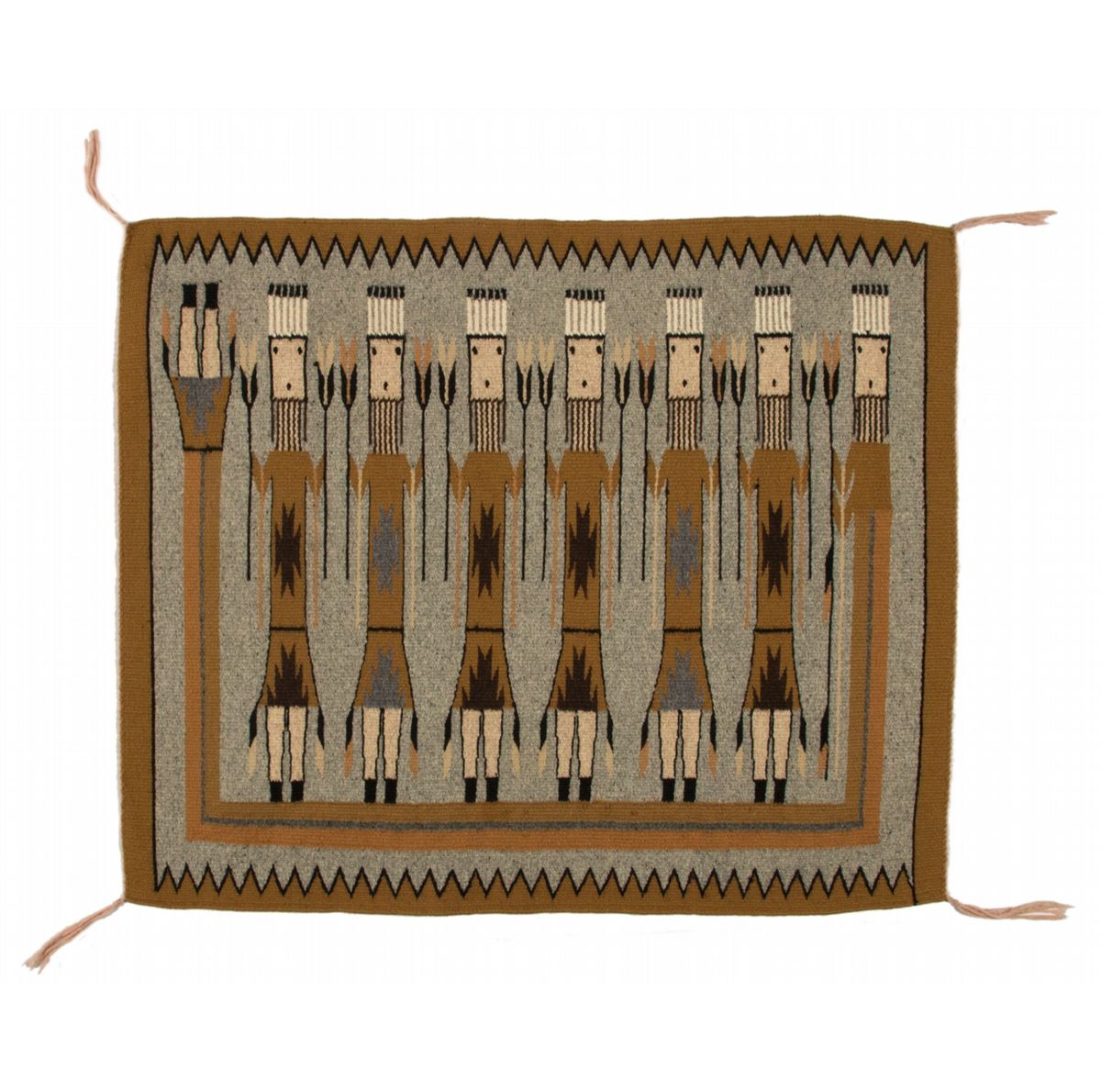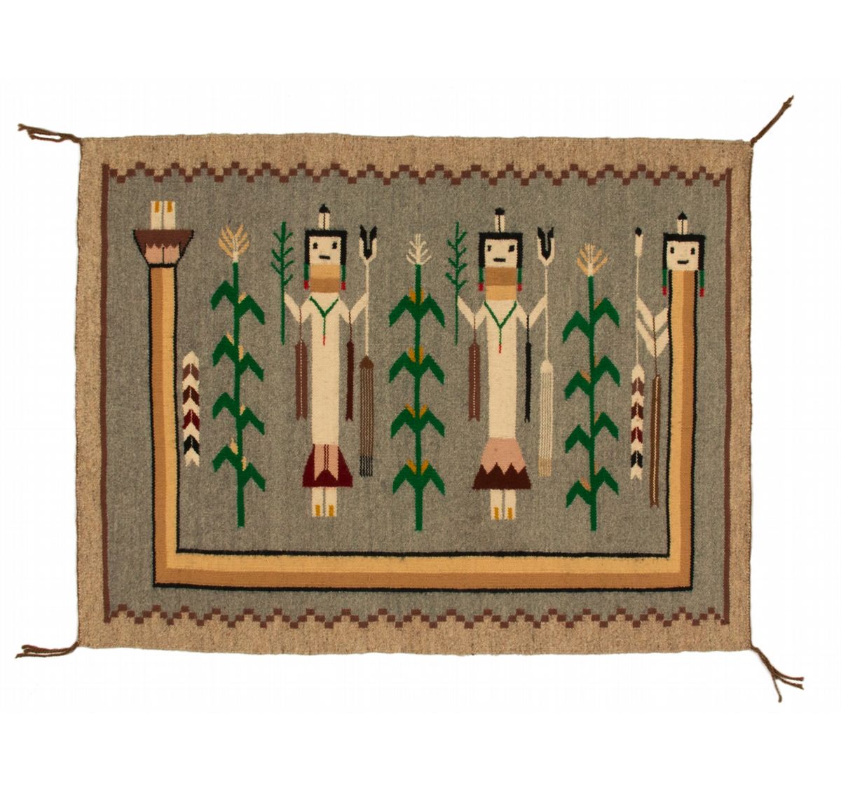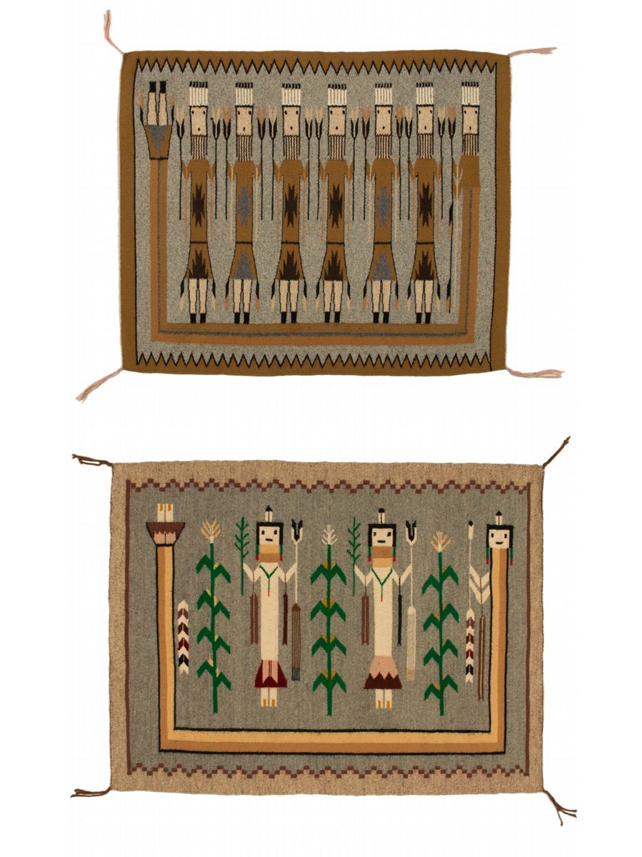 Two Navajo Weavings. 1. 2'10" x 2'5". Navajo Yei. Natural and vegetal dyed. Late 20th century. 2. 3'2" x 2'5". Navajo Yei woven by Carmen Tyler. Two figure separated by cornstalks and surrounded by a Guardian. Late 20th century. Provenance: Golden Eagle Trading Co.