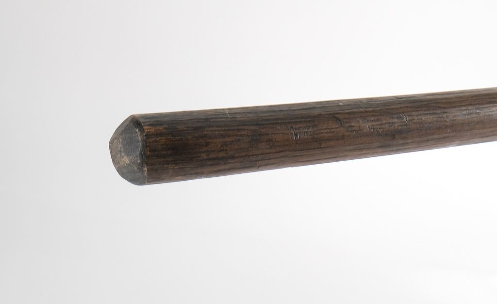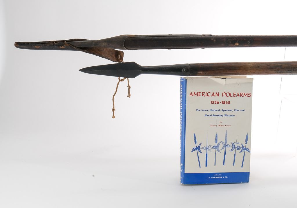 Likely American, 18th and or 19th Century. The longer of the two resembling a model of 1816 with original Leather Scabbard with tie. Unmarked, riveted to a square wood pole, with old rivets and missing metal tag. Good age and good patina throughout, minor worm-holes to wood, spear tip measures 18" overall length is 80" The second with a spade or diamond point tip, with through holes for mounting, currently set with one older steel or iron wood screw. Unmarked, Hand Carved round shaft, metal and wood cleaned (likely long ago). Tip measures 9", overall length is 64.5". This lot also includes a copy of "American Polearms 1526-1865" by Rodney Hilton Brown. This is a special shipping item and will incur oversize shipping charges. Keywords: Polearm, Antique, Civil war, Revolutionary War,