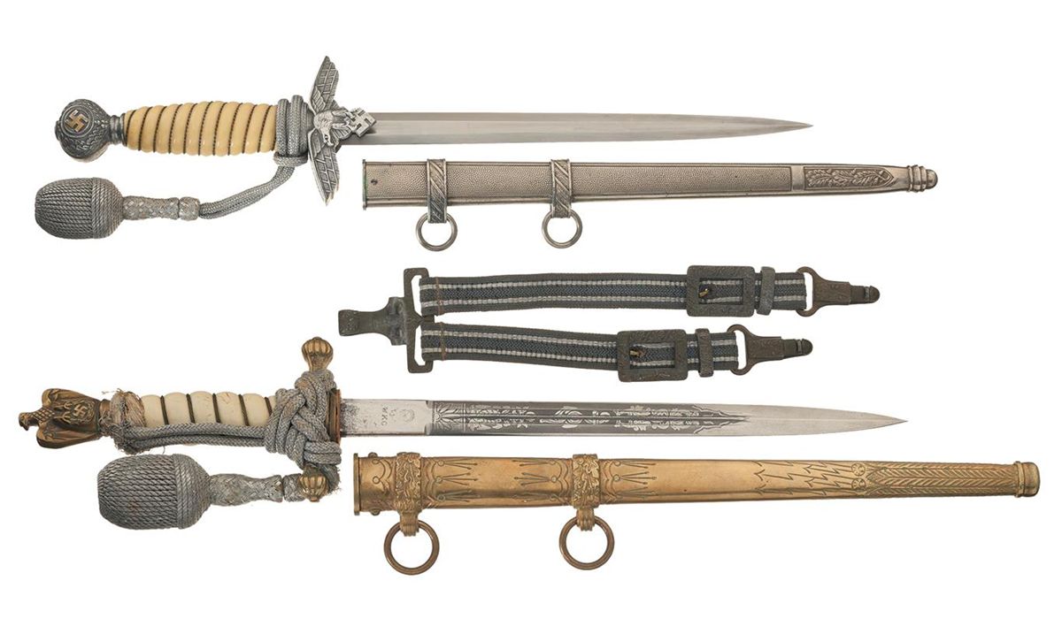 1) SMF Second Pattern Luftwaffe Dagger, 15 1/4 inches overall with a 10 inch "droop wing eagle/5" marked blade, polished alloy fittings, wire wrapped white celluloid grip and a silver portapee with matching acorn. With a nickel finished alloy scabbard marked "J.G.54" on the throat and a belt hanger with square buckles and a "U.E.10 RZM" marked hook. Though not confirmed, "J.G.54" may indicate Jagdgeschwader 54, also known as the Green Hearts. At 9,600 (yes, nine thousand six hundred) kills, JG 54 is the second most successful fighter wing in human history, having served as bomber escorts and air superiority fighters in the invasions of Poland and France, participated in the Battle of Britain, and spent most of the war on the Eastern Front. Virtually obliterated during a last stand on the Courland Peninsula in Eastern Prussia/Belarus, the survivors of JG 54 continued to fight on the Western Front until the last weeks of World War II. 2) WKC Second Pattern Kriegsmarine Dagger, 14 3/4 inches overall with a 9 1/2 inch etched double fuller blade, gilt brass hilt fittings wire wrapped white celluloid grip and a silver portapee with matching acorn. With an engraved brass scabbard.