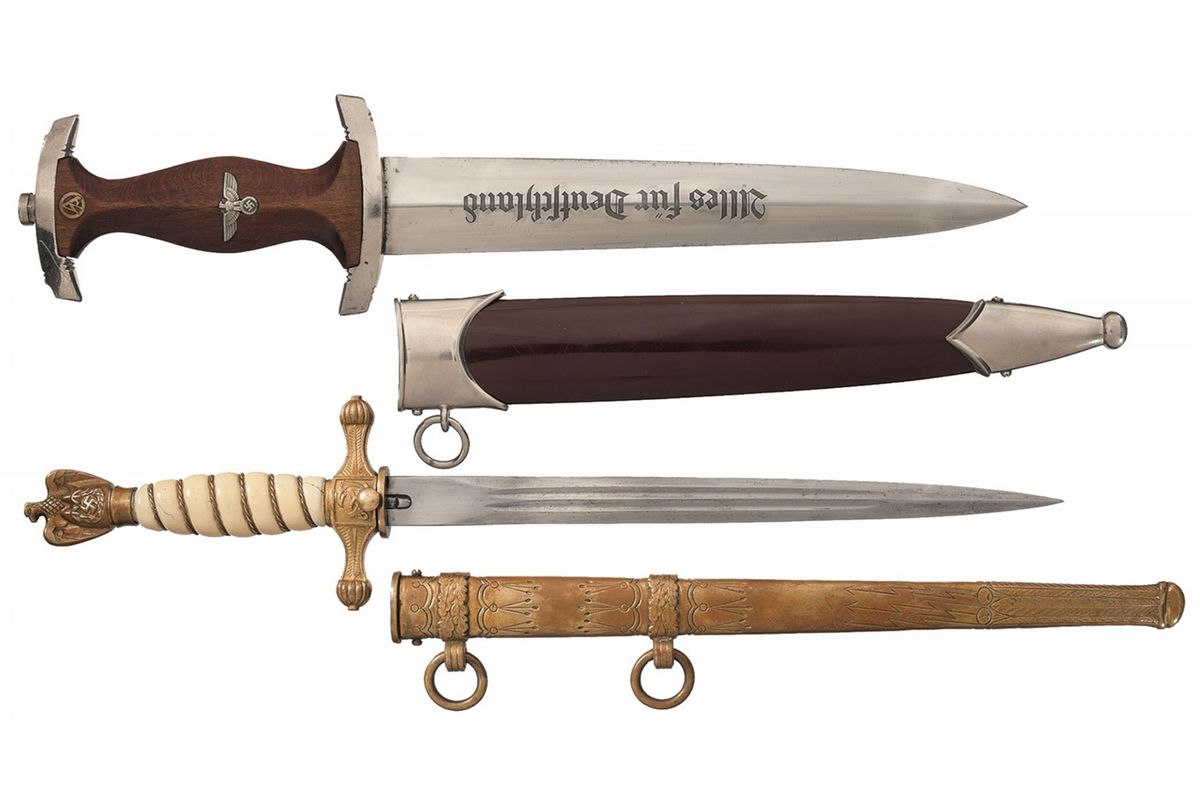 1) SA dagger, 8 5/8 inch blade (13 5/8 inch overall) marked "RZM", "M7/19" (A. Werth, Solingen) and "1938" on one side, nickel hilt and sheath fittings, wood grip with enameled SA medallion and brown enamel sheath. 2) Second Pattern Kriegsmarine Dagger, 9 1/2 inch blade (14 3/4 overall) with no makers markings, gilt brass fittings, wire wrapped white celluloid grip and engraved gilt brass sheath.