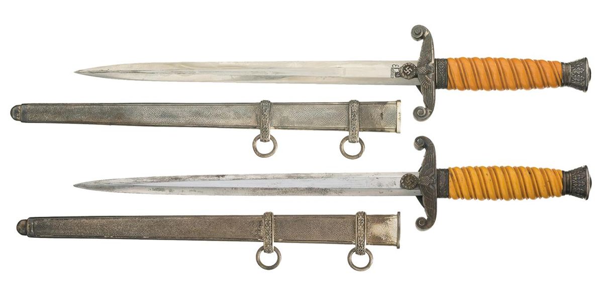 Both daggers have 10 inch blades, darkened nickel fittings, twist pattern celluloid grips, and darkened nickel scabbard with oak leaf pattern suspension bands. 1) Eickhorn dagger, 14 7/8 inches overall, with orange celluloid grips. 2) Puma Brand dagger, 14 3/4 inches overall, with a yellow celluloid grip.