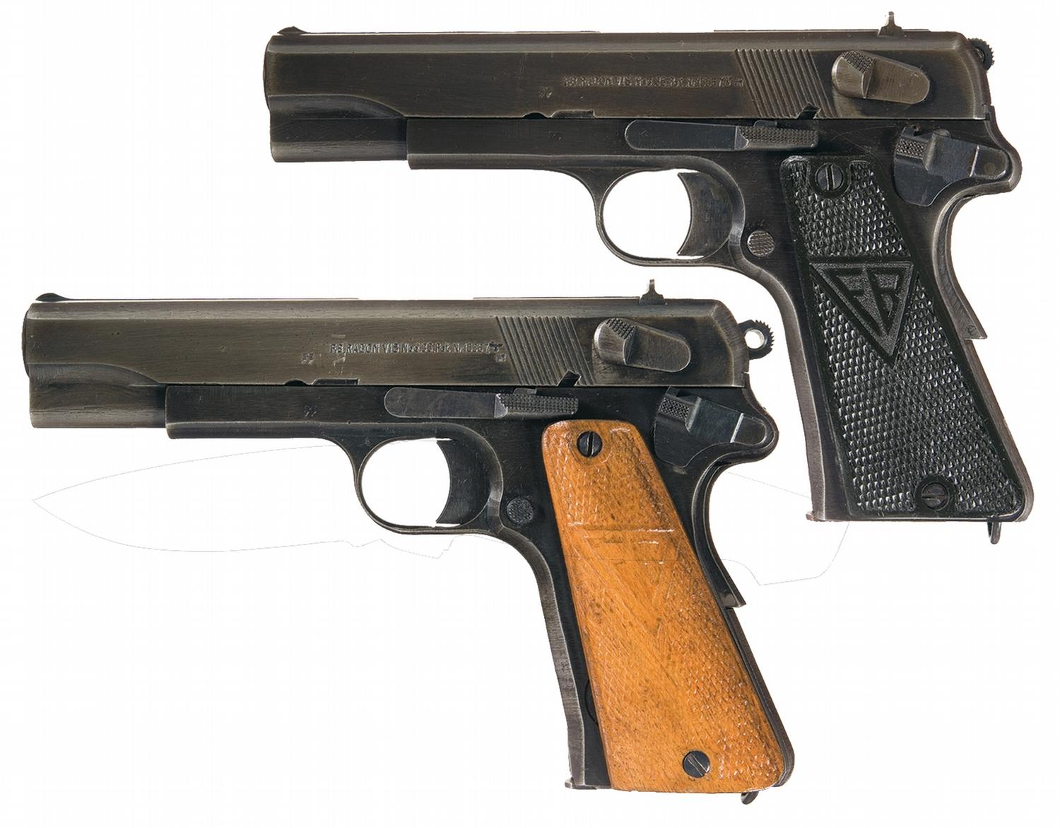A) Late production model with one line model designation and patent marking on the slide, with eagle/77 acceptance marks on the slide and frame. The slide also has an eagle firing proof and an eagle/623 proof. Slide and barrel are numbered to gun. Standard "VIS" and "FB" molded grips. The bottom of the magazine has an eagle/189 proof.