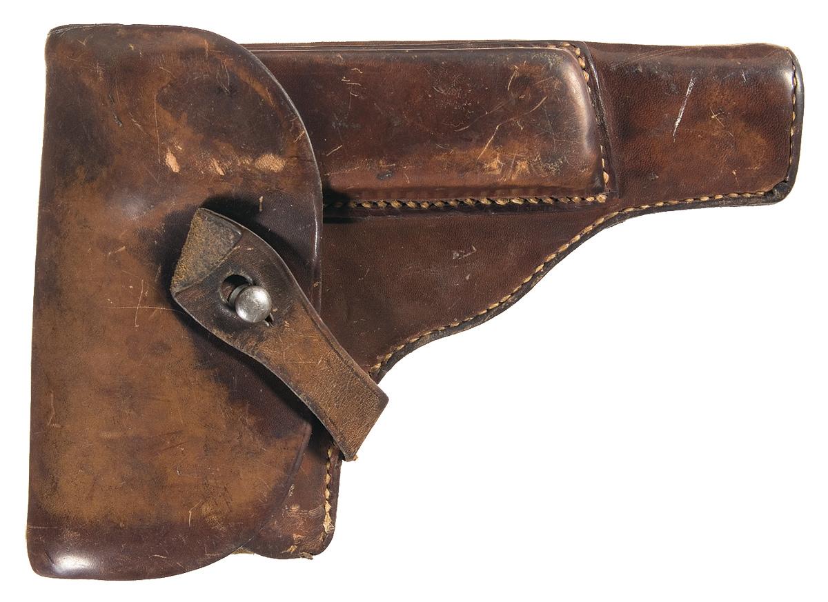 Condition: Very good, with 70% fading blue overall. The slide retains traces of original blue in the protected areas with the balance a smooth gray patina. The frame retains 85% original blue finish with the balance a smooth gray patina. There is some minor pitting. The well worn grips are good with a few minor pressure dents and a filled repair (bottom of right panel). The holster is very good with some minor handling marks, both belt loops having been resewn on top (remaining stitching is tight).
