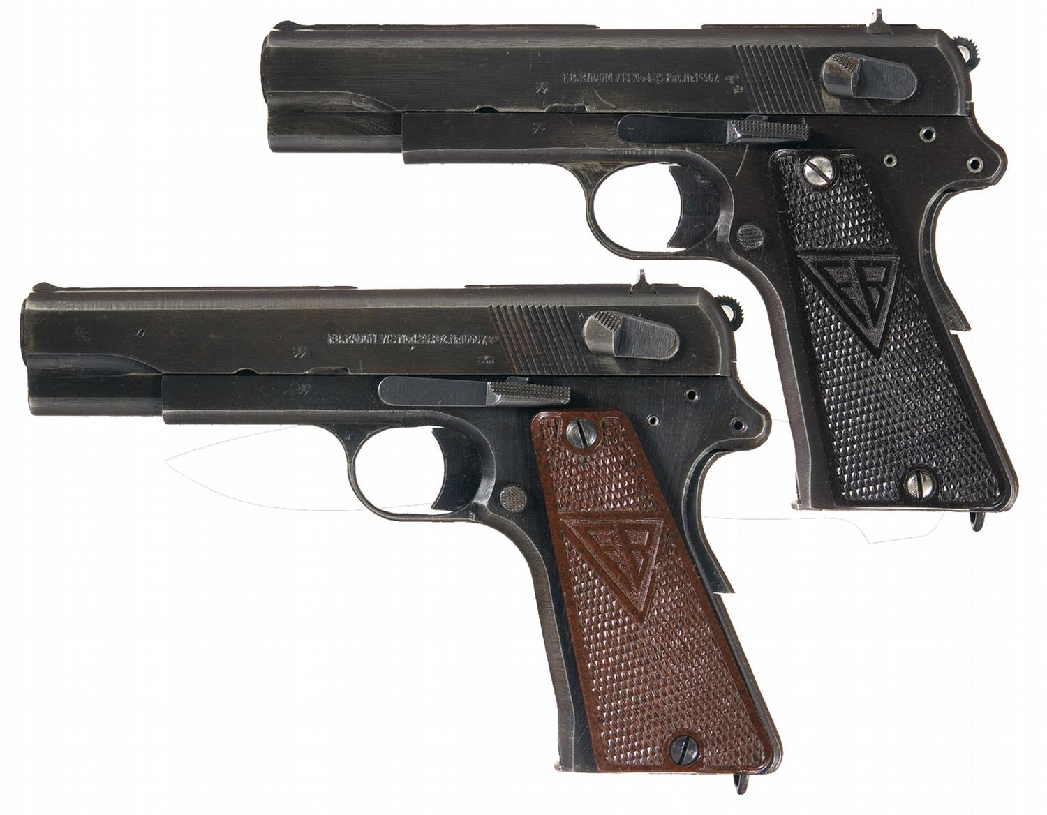 Standard one line model marking on the slide, with eagle/77, eagle firing proof, and eagle/WaA623 proofs. Produced without the takedown catch. Both sides of frame have an eagle/77 proof. Slide and barrel are numbered to gun, with the letters "X", backwards "J" and "W" along with the number "0143" marked on the left rear side of the slide. Standard "FB" and "VIS" molded grips. Complete with a leather holster (illegible marking on inside of flap) and extra magazine.