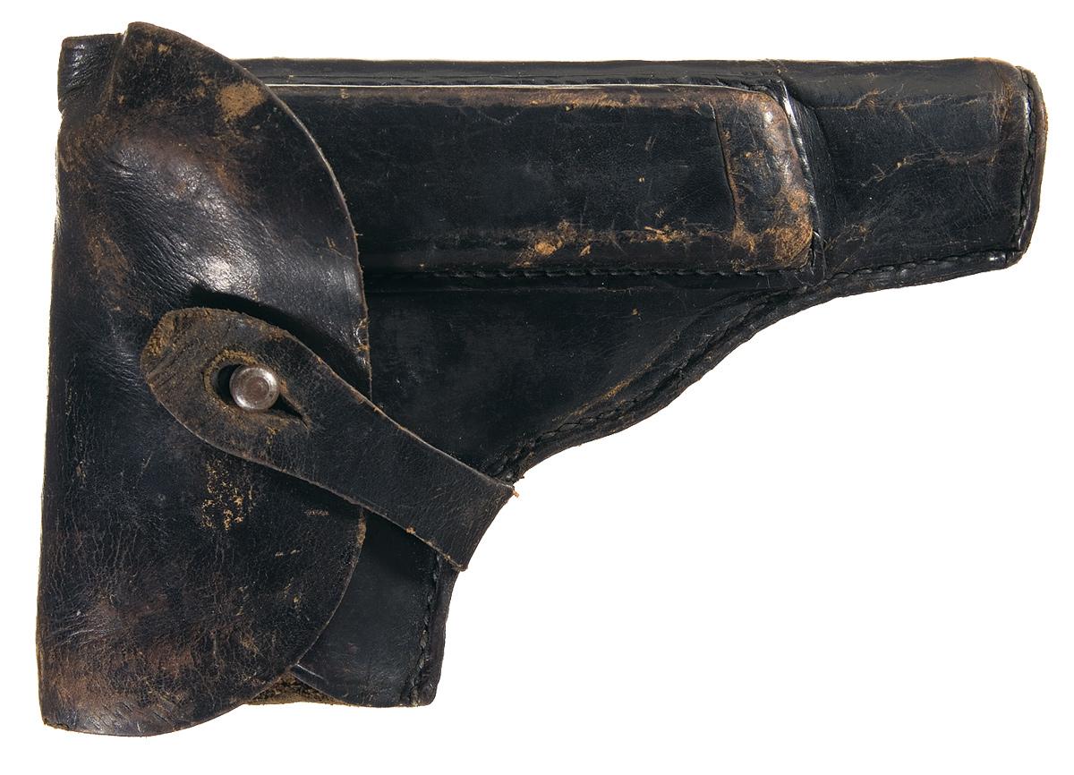 Condition: Very good. The pistol retains 85% original blue finish thinning overall and turning to a brown patina with a smooth brown-gray patina on the grip straps and grip safety. There is limited minor pitting. The grips are fine with a few gouges (mostly on the left panel) and a few minor dings in the overall crisp checkering. The holster is good with some minor flex wear and handling marks. The stitching is tight.