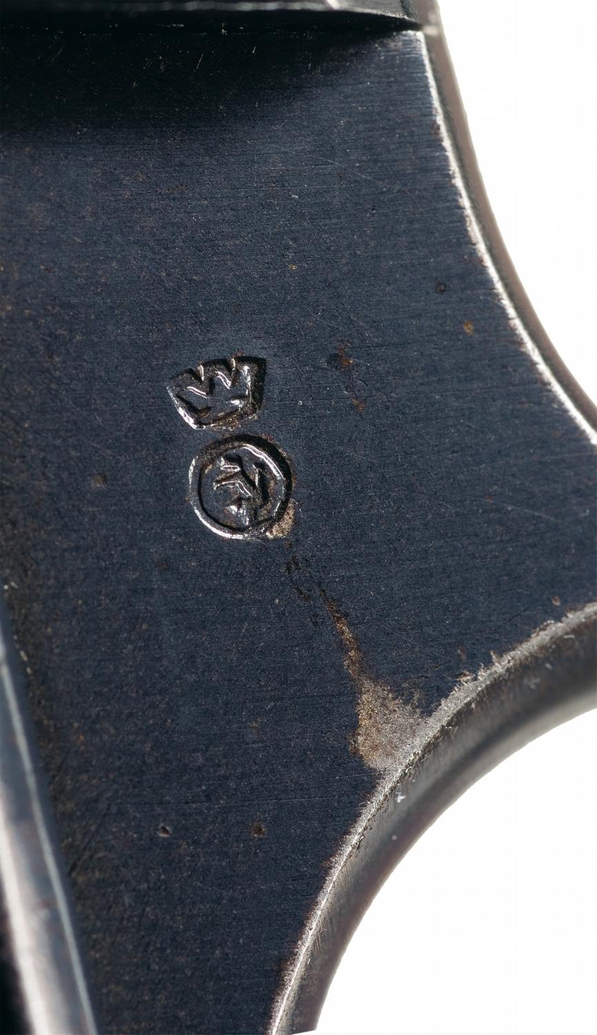 Manufactured during German occupation of Italy during the Second World War, the pistol has the faintly stamped eagle/162 Nazi acceptance stamp on the right side of the grip tang. The slide has the German occupation legend "P. BERETTA-CAL. 7.65-BREVETTATA / GARDONE V.T. 1944". The left grip tang has a Brescia crown/lion proof and a boxed "MA" on the right side of the trigger guard. The pistol is fitted with the standard metal backed black plastic grips with "PB" emblem and blue finish. Matching serial number on the slide and frame. In Jan Still's book "AXIS PISTOLS", Vol. II (page 107), the serial number of this pistol is not listed as being one of the 19 reported Model 1935 pistols stamped with the rare German Army acceptance proof. It is different than most of the other known examples.