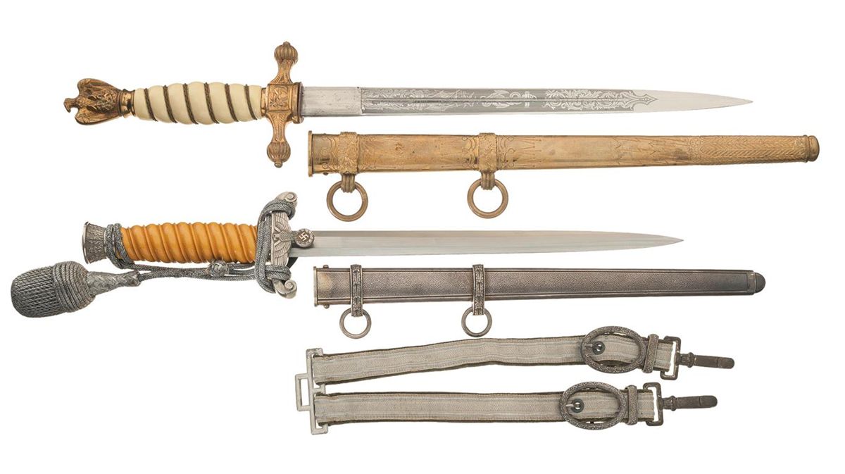 1) F.W. Hoeller Second Pattern Kriegsmarine Dagger, 15 inches overall with a to inch etched double fuller blade, gilt brass fittings, wire wrapped white celluloid grip and a gilt brass scabbard. 2) A. Schuettelhoefer & Co. Heer Dagger, 14 3/4 inches overall with a 10 inch blade, light orange celluloid grip, silver portapee and acorn, darkened nickel hilt fittings and scabbard, and a green felt/silver wire hanger with oval buckles.