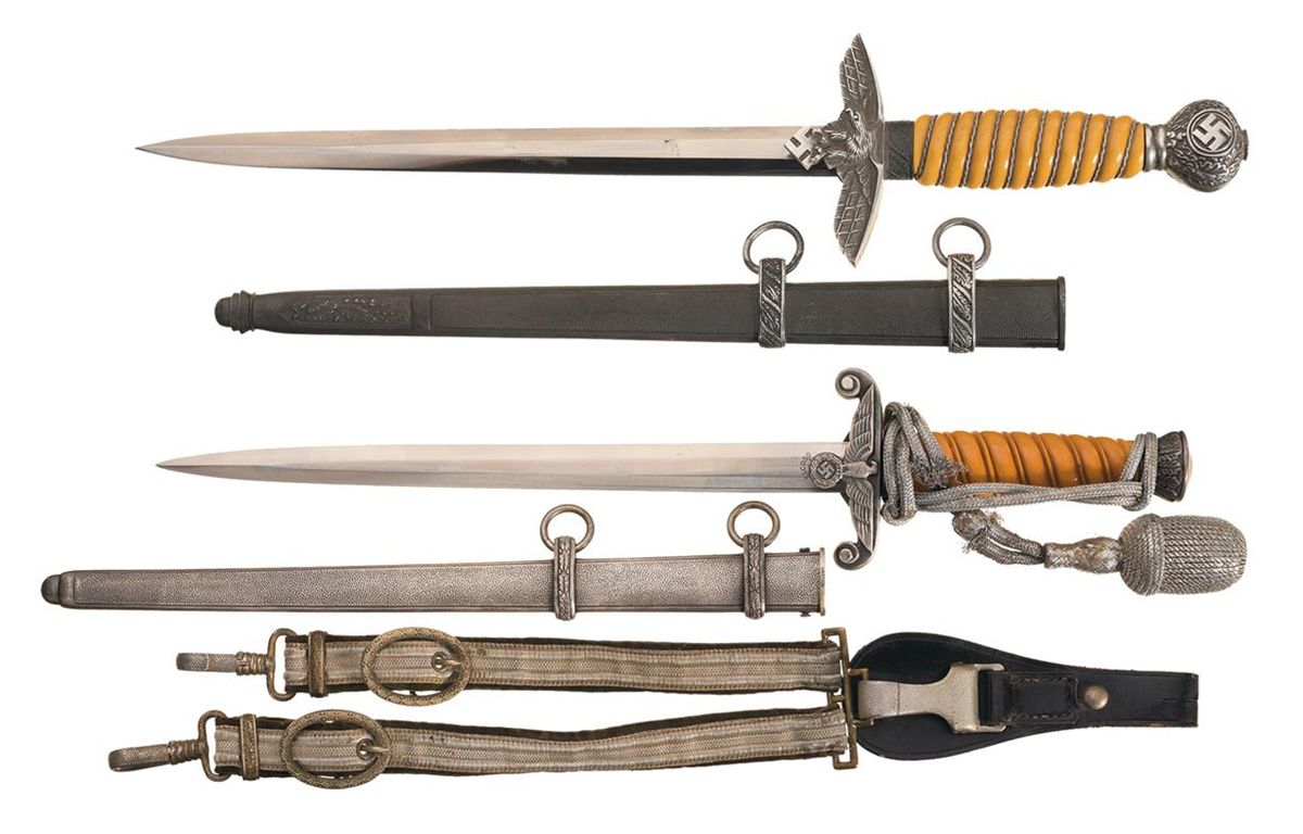 1) Eickhorn 2nd Pattern Luftwaffe Dagger, 15 1/4 inch overall, 10 inch blade, alloy fittings, silver wire wrapped yellow celluloid grip, and an alloy scabbard. 2) Alcoso Heer Dagger, 14 1/4 inches overall, with a 10 inch blade, orange celluloid grip, aged nickel fittings, a silver wire portapee with matching acorn, aged nickel finished scabbard with a round buckle hanger and a black leather belt loop.