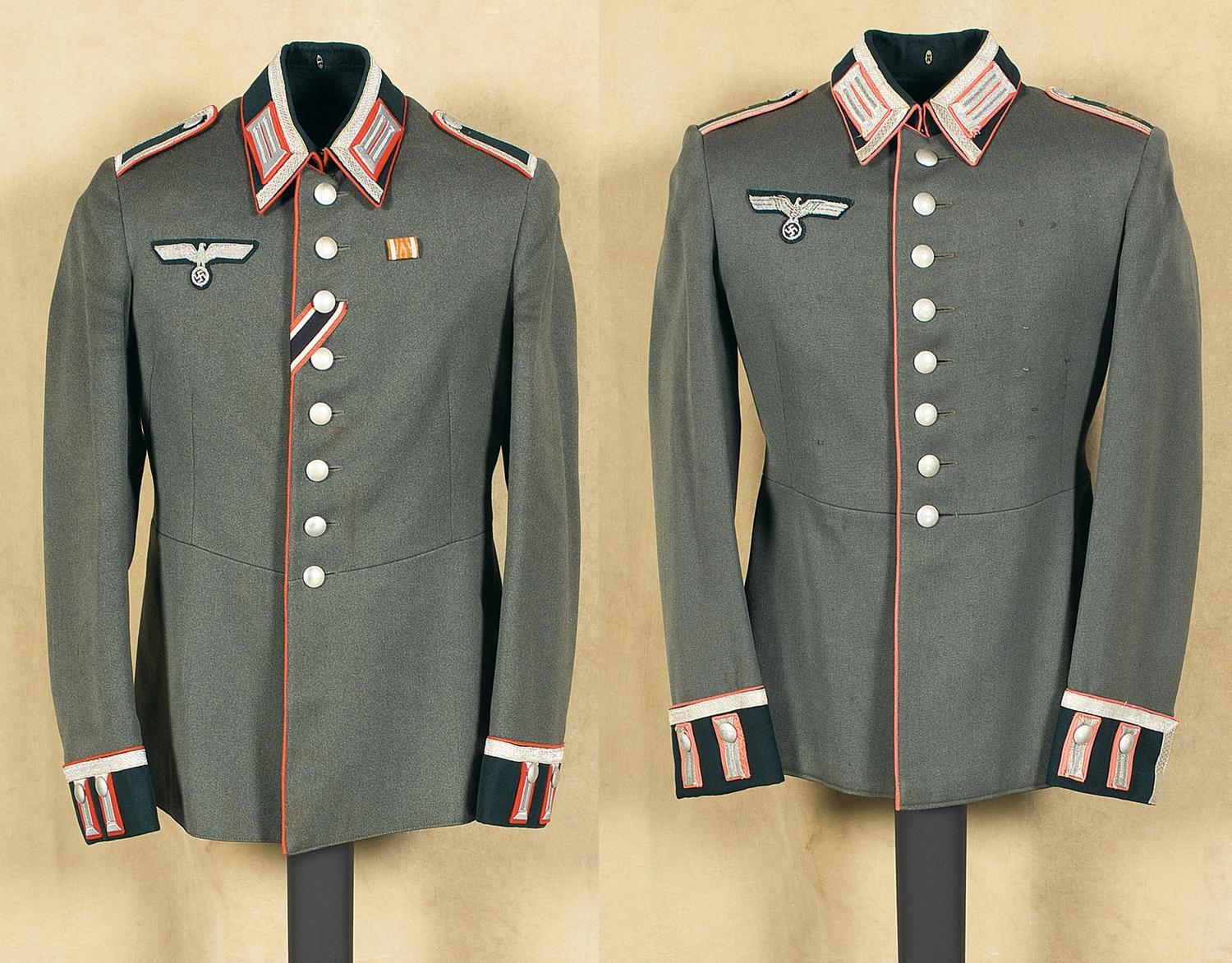 Both tunics are field gray, with green cuffs and collars, silver trim, aluminum buttons and a silver bullion Nazi eagle on the right breast. 1) Artillery Unterwachtmeister's jacket, red waffenfarbe, "4" on the shoulder buttons, and a yellow and white ribbon on the left breast. 2) Panzer Unteroffizer's jacket, with pink waffenfarbe, "S/ 2" on the shoulder boards and "1" on the shoulder buttons.