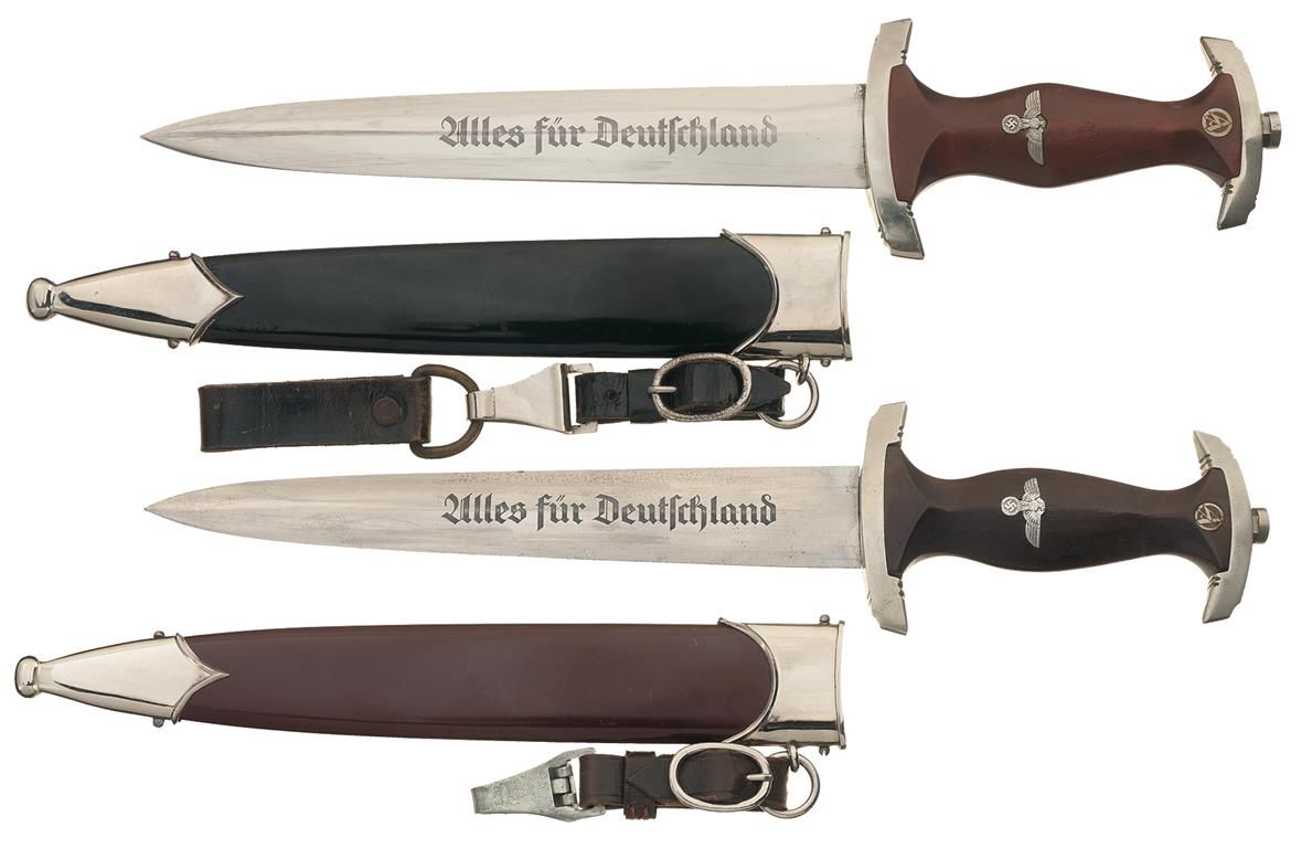 Both blades measure 13 5/8 inches overall, with "Alles fur Deutschland" etched 8 3/4 inch blades, nickel hilt fittings, brown hardwood guards with SA medallions, and enamel and nickel finished scabbards with matching colored leather belt hangers and RZM "M5/71" (Overhoff & Co., Luedenscheid) clips. 1) Puma brand NSKK dagger, with a "Wf" marked guard, black enamel scabbard and a leather belt loop. 2) SMF production SA dagger, with a RZM "M7/9/1941" blade, "Ho" marked guard and a brown enamel scabbard.