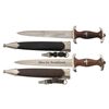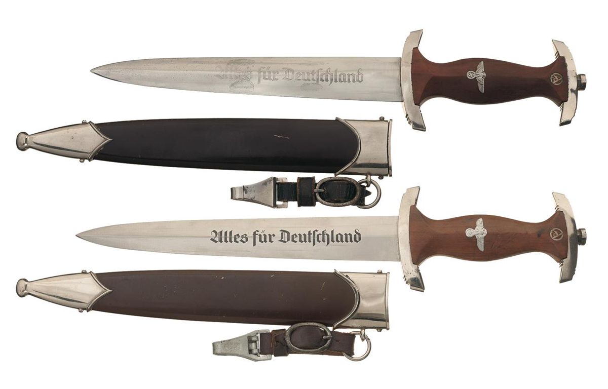 1) Unbranded SA dagger, 13 3/8 inches long, with an 8 1/2 inch blade, etched "Alles fur Deutschland" on one side, with nickel finished fittings, hardwood grip with "SA" medallion, and brown enamel finished sheath with leather hanger marked with the RZM "M5/71" (Overhoff & Co.) on the clip. Though not confirmed, the polishing of the blade, especially on the reverse, may indicate that this dagger was once a Rohm Honor Dagger that had it?s inscription obliterated on Party orders following the Night of the Long Knives. 2) Arthur Schuettelhofer SA dagger, 13 5/8 inches overall with an 8 5/8 inch RZM "M7/13" marked blade, with a hilt, sheath and hanger similar to #1.