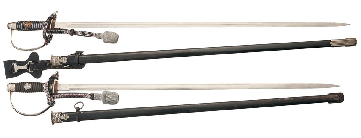 Both swords were manufactured in Solingen, with straight single fuller blades, nickel finished single bar guards and pommels, oak leaf grip collars and "police eagle" ornaments, a black leather portapee with silver and red accents and a silver portapee, and black enamel scabbards with nickel fittings. 1) Paul Weyersberg police sword, 38 1/2 inches overall with a 33 inch blade, alloy wire wrap on the hard rubber grip, and a black leather belt hanger and extension. 2) Herman Rath police sword, 34 7/8 inches overall with a 29 1/2 inch blade bearing an intertwined "SS" stamp on the left ricasso and a ribbed hardwood grip.