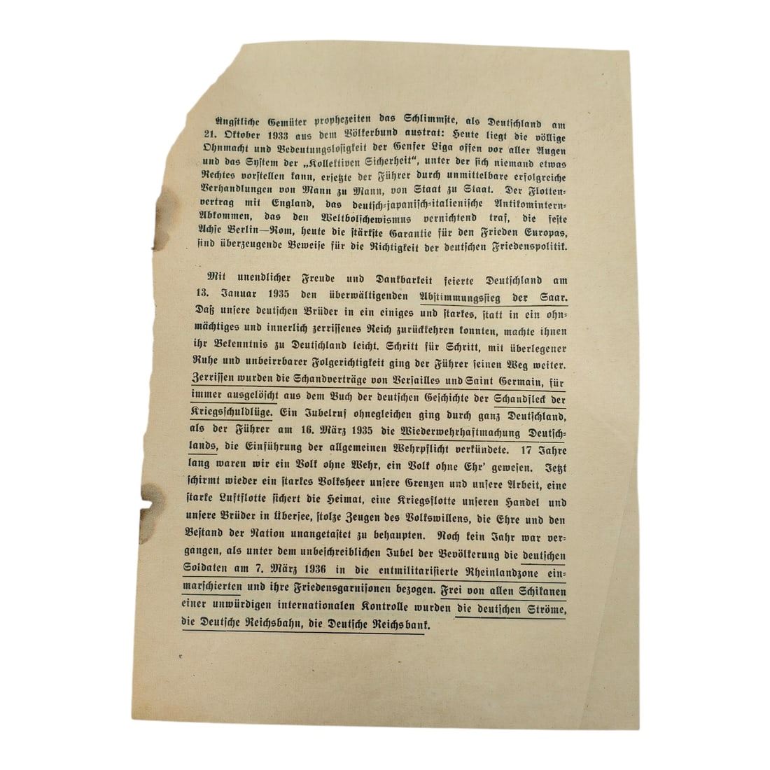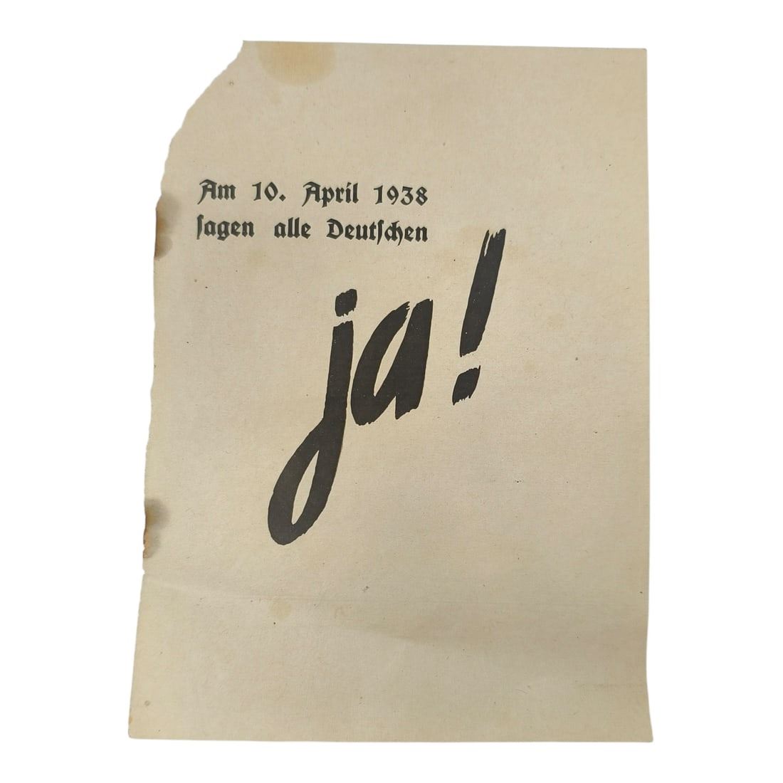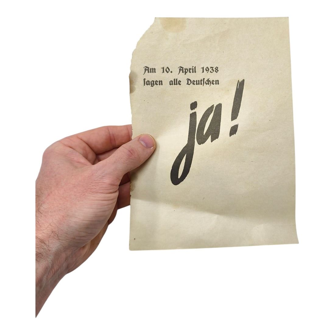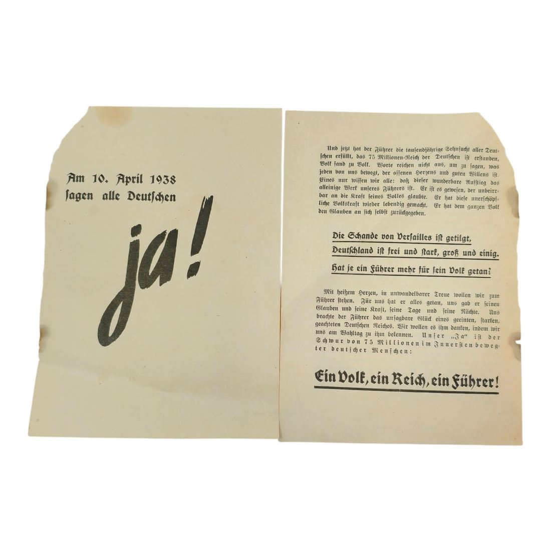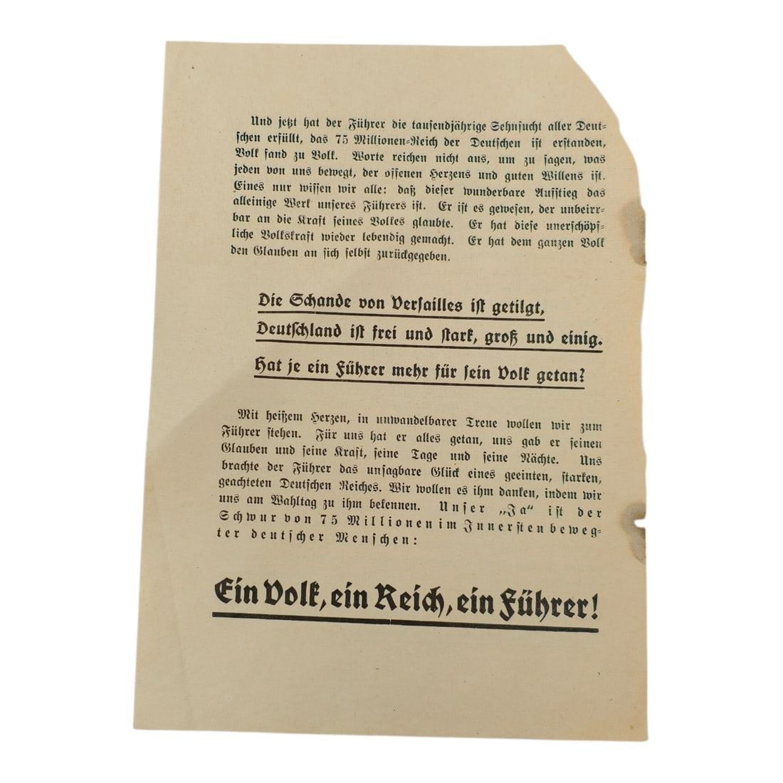 And now the Führer has fulfilled the age-old longing of all Germans. Seventy-five million Germans are united in one great national community. Every one of us, citizens of the new Greater German Reich, knows this: His happiness and his future he owes to the creative work and tireless efforts of our Führer. It was he who restored our sense of worth. He saved the honor of our people. He gave our entire nation back its faith in itself.The shame of Versailles has been erased. Germany is free and strong, great and united. Has any leader ever done more for his people?With this “Yes,” in unshakable loyalty, we wish to declare to the Führer: What he has given us, we shall guard. What he has created, we shall protect. What he has begun, we shall complete!One People, One Reich, One Führer!