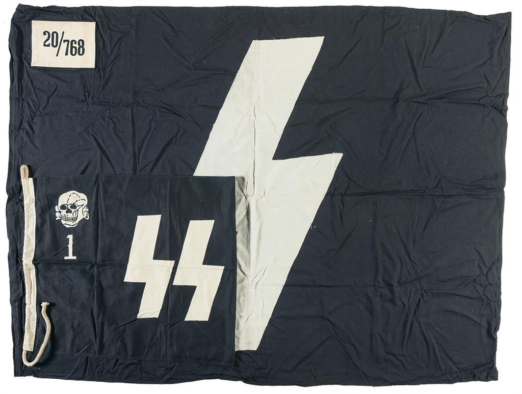 One Nazi SS style tank flag approximately 35"L x 21"W and one German American Bund style black unit flag approximately 58"L x 44"W.