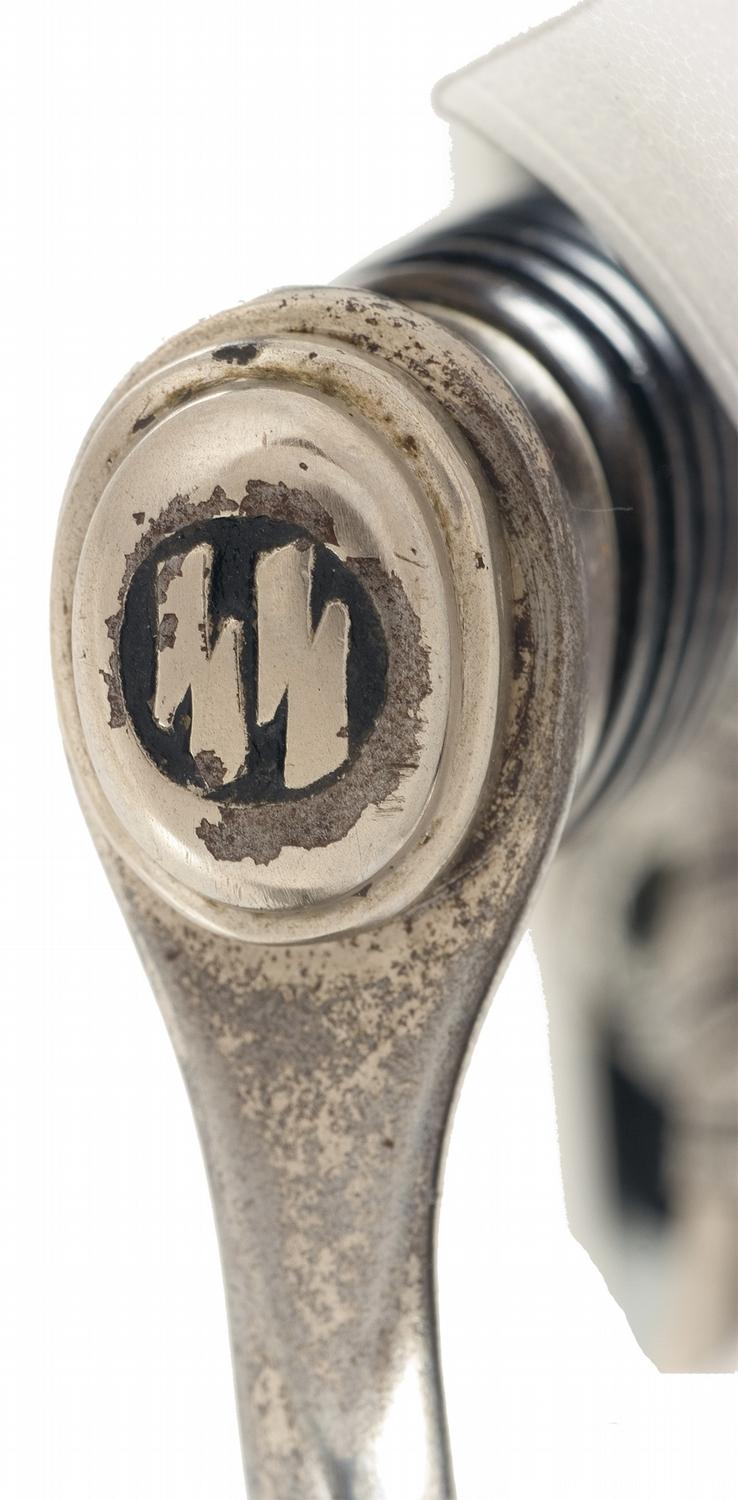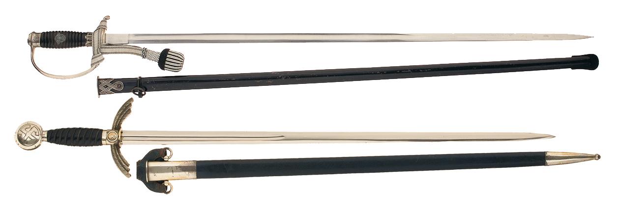 1) Nazi Police Official's Sword, 33 1/4" single fuller straight edge blade, stamped on the left ricasso with a pair of overlapping "sig" lightning runes, no other makers marks. Nickel finished knuckle guard and ribbed horn grip, with the police "eagle in wreath" badge on the right side of the grip and the SS runes on the pommel. With a black and silver portapee, matching solid acorn, and a black painted steel sheath with weave-pattern throat accent. 2) Eickhorn Luftwaffe Flyer's Sword, 28 1/2" double edged blade with short single fullers, marked with the Eickhorn logo on one side. Nickel finished guard and hilt, with feather, oak leaf and sunwheel designs and a wire wrapped blue leather grip. The underside of the guard is marked "Nr.40" and "Fl.Gr. Gottingen(ZA)". Gottingen was home to the Aerodynamische Versuchsanstalt, an advanced aerodynamics lab and wind tunnel establishment, and 2./Versuchsverband Ob.d.L, a.k.a. "Zirkus Rosarius", which analyzed and flight tested captured Allied aircraft. Blue leather sheath, with nickel throat and tip and a blue leather hanger.