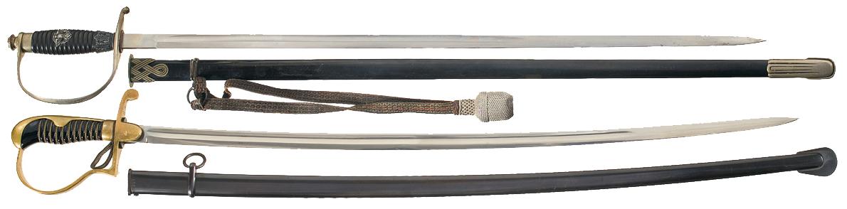 1) Berg & Co. (Solingen) officer's sword, 31 1/2" single fuller blade, with "WaA253" stamps (some partial) on the blade, guard, collar and hilt, "295" on the guard ahead of the blade, "C.E./39" behind, wire and celluloid grip, leather finger loop and blue finished sheath numbered to match with hanging ring. 2) Puma (Solingen) police sword, 29 1/2" single fuller blade, nickel finished guard, oak leaf accents and wreathed Nazi eagle on the grip, and a black enamel sheath with cleaned throat and tip, leather portapee with silver and red wire, and silver acorn.