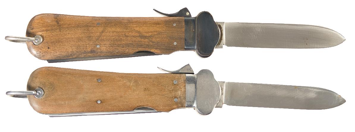 Condition: 1) Very fine, with some bright wear on the grip section and minor spotting. 2) Fine. The blade release/locking lever is broken and there are some light handling, spotting and sharpening marks.