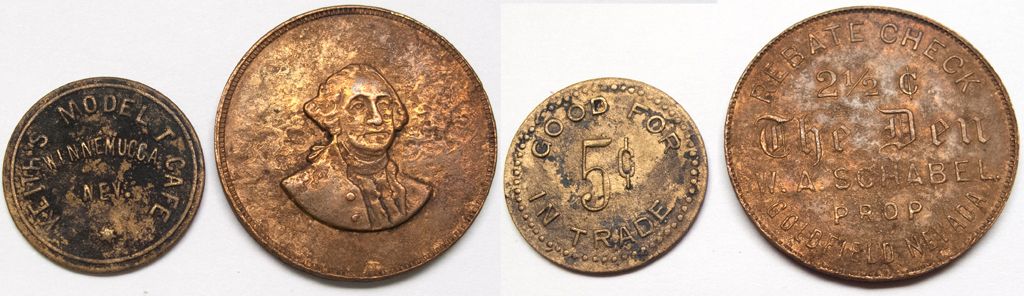 1) Rebate check / 2 1/2c / The Den / W. A. Schabel / Goldfield, Nevada // [picture of George Washington]. Brothel. 2) Keith's Model T Café / Winnemucca, Nevada // GF 5c IT.