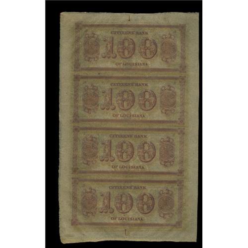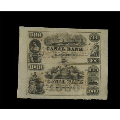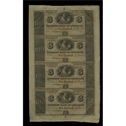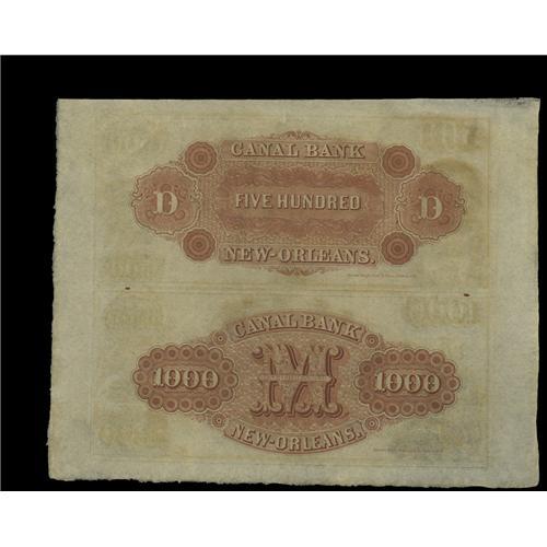<B>Two New Orleans Uncut Sheets.</B></I><BR><B>New Orleans, LA- Canal Bank</B></I> $500-$1000 18__ G70a-G80a Uncut Sheet <B>Choice CU</B></I><BR><B>New Orleans, LA- Citizen's Bank of Louisiana</B></I> $100-$100-$100-$100 18__ G46b-G46b-G46b-G46b Uncut Sheet <B>Choice CU.</B></I><BR>Both sheets are nicely preserved.<BR><I>From The Collection of Richard A. Beck</B></I> <BR><BR><B>Important notice:<
