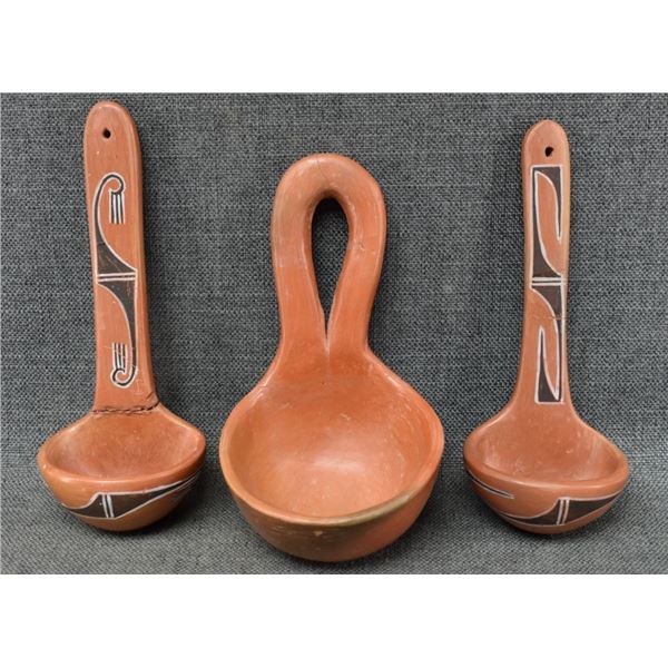 1960's Hopi Indian. Hand coiled And painted design pottery ladles, 9'' x 3'' x 3.75''. 8' x 5'' x 4.5'...